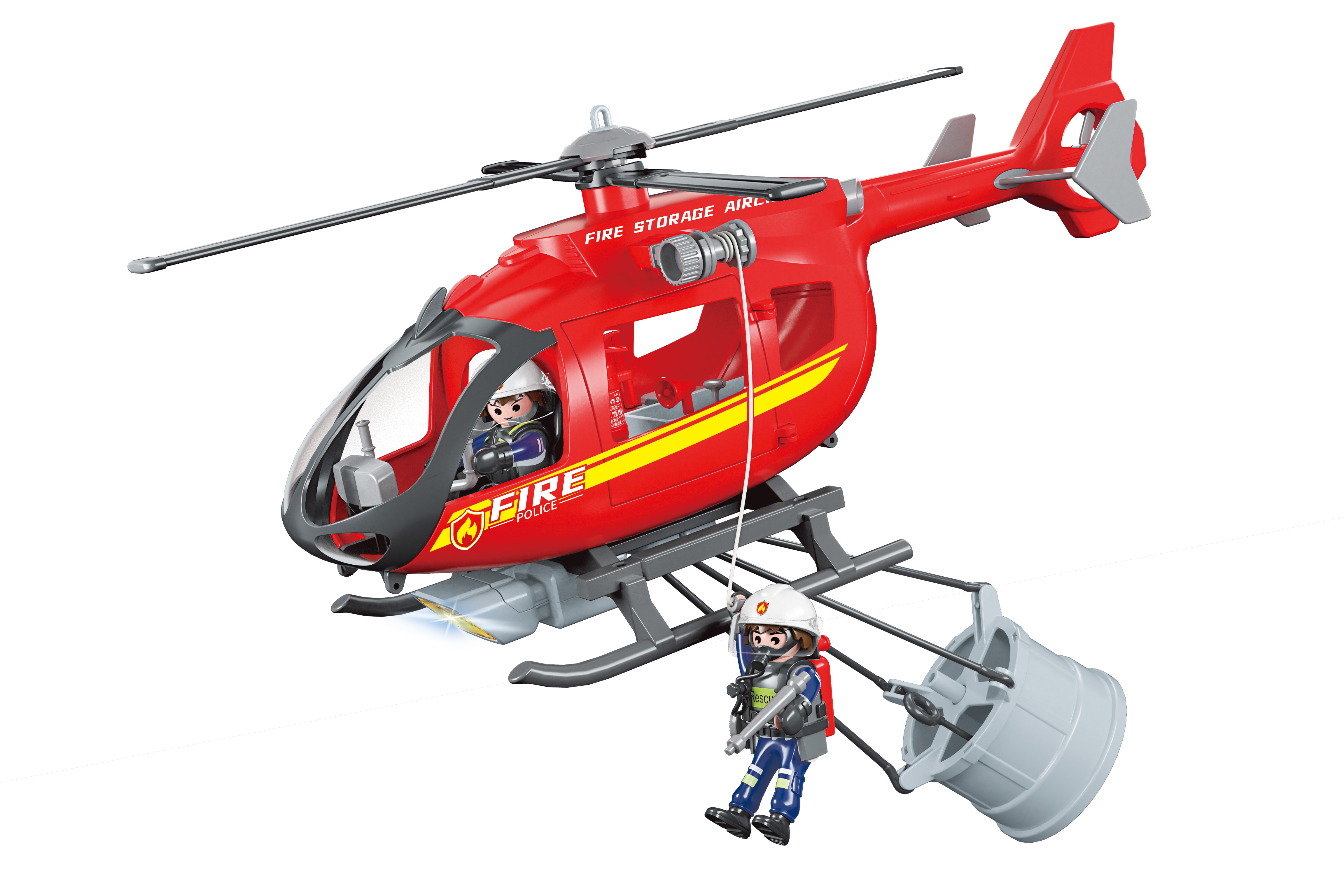Helikoptéra hasiči s efekty. Velikost 38cm. Helikoptéra má otevírací dveře a kabinu, vejdou se dovnitř dva panáčci. Světelné a zvukové efekty. Návod uvnitř. Baterie 3xLR44 součástí