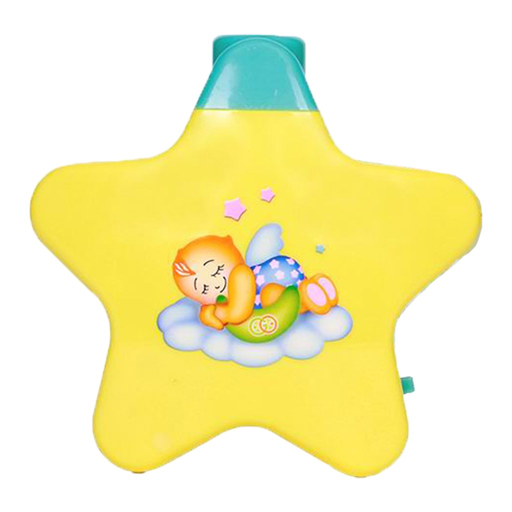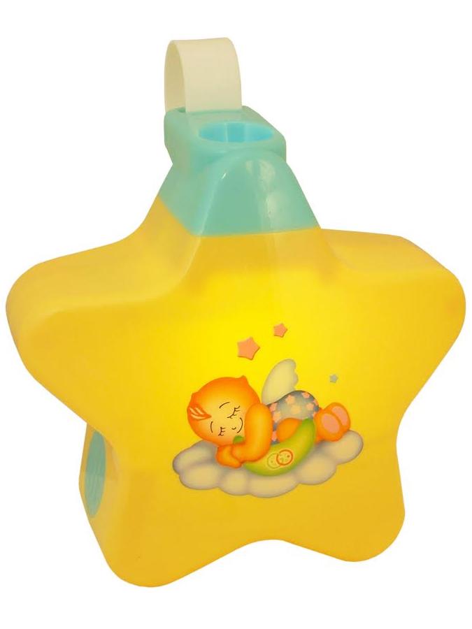 Hudební projektor pro miminka. Projektor ve tvaru hvězdičky promítá na strop krásné obrázky hvězdiček a medvídka a hraje 3 ukolébavky. To vše pomůže spolehlivě usnout Vašemu malému děťátku. Hvězdičku lze pomocí plastového pásku přichytit k postýlce nebo nechat stát volně. Na hvězdičce je tlačítko pro vypnutí a zapnutí ON/OFF. Poloha tlačítka ON má dvě možnosti, které určují hlasitost melodií. Projektor má samostatné tlačítko, kterým se zapíná hudba a samostatné tlačítko, kterým se zapínají pohyblivé obrázky. Vše může být zapnuto dohromady i zvlášť. Vyrobeno z kvalitního plastu. Určeno pro děti od narození. Baterie jsou součástí balení. Rozměry cca 15x15 cm.