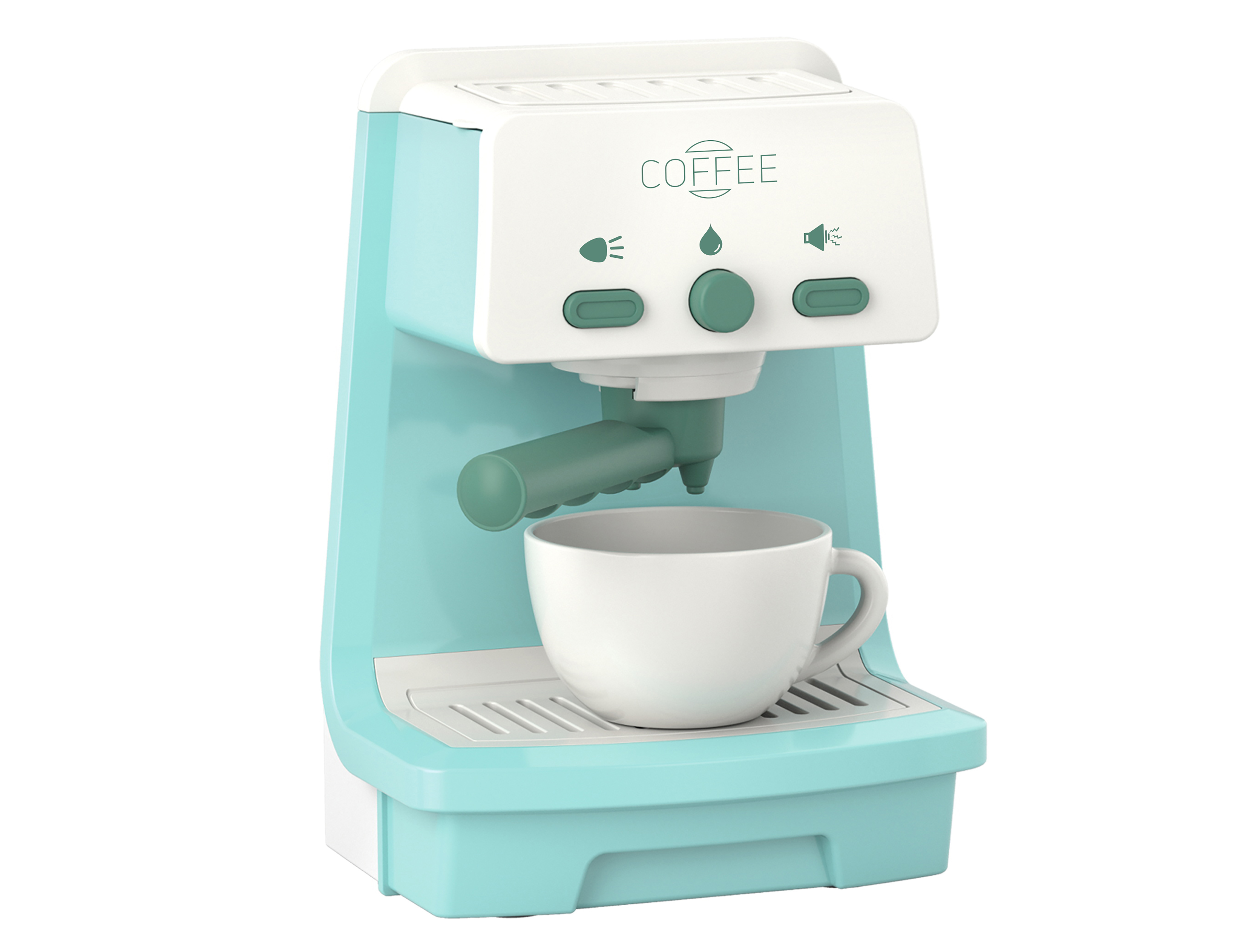 Kávovar s efekty. Velikost 16 cm. Světelné a zvukové efekty. Baterie 2xAA nejsou součástí balení. Přesné rozměry 13x9x16 cm.
