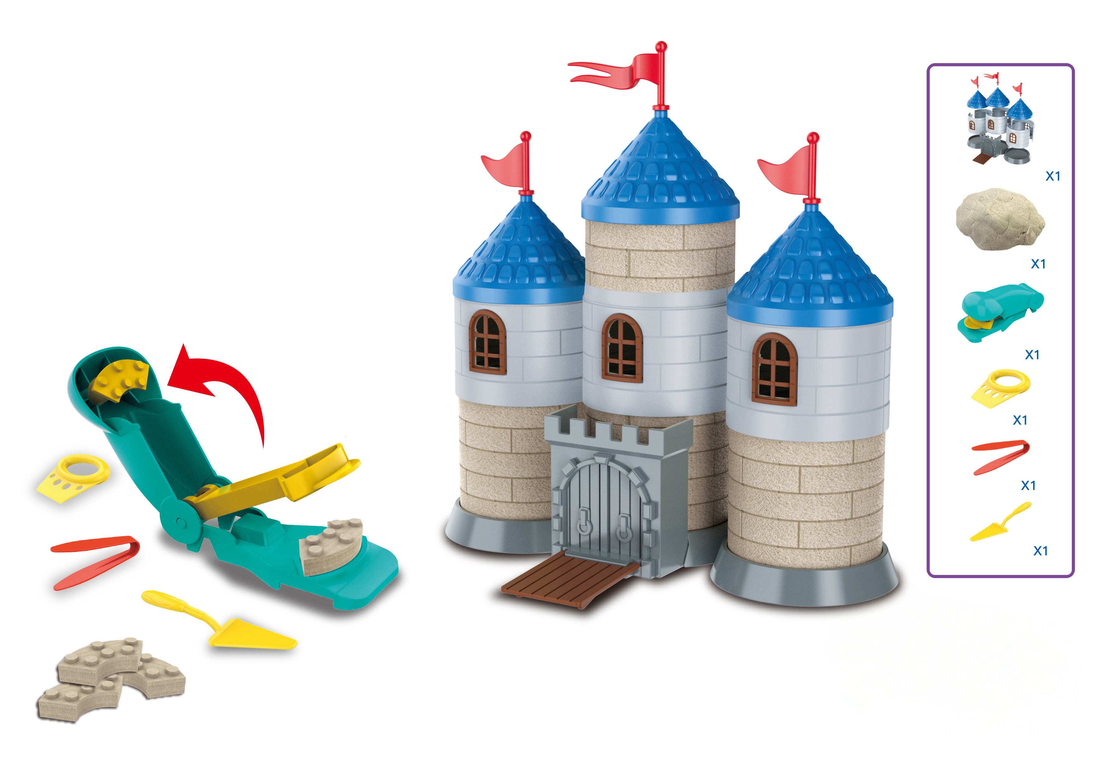 Kinetický písek sada na stavbu s cihliček Hrad. Obsah balení 750g. Obsahuje formu na tvorbu cihliček. Balení také obsahuje díly na stavbu hradu a další nástroje na práci s pískem. Obrázkový návod na zadní straně obalu. Po vytažení z formičky nechejte písek 1 minutu schnout. Pokud potřebujete menší cihličku, rozkrojte větší na půl, pomocí přiloženého nástroje.