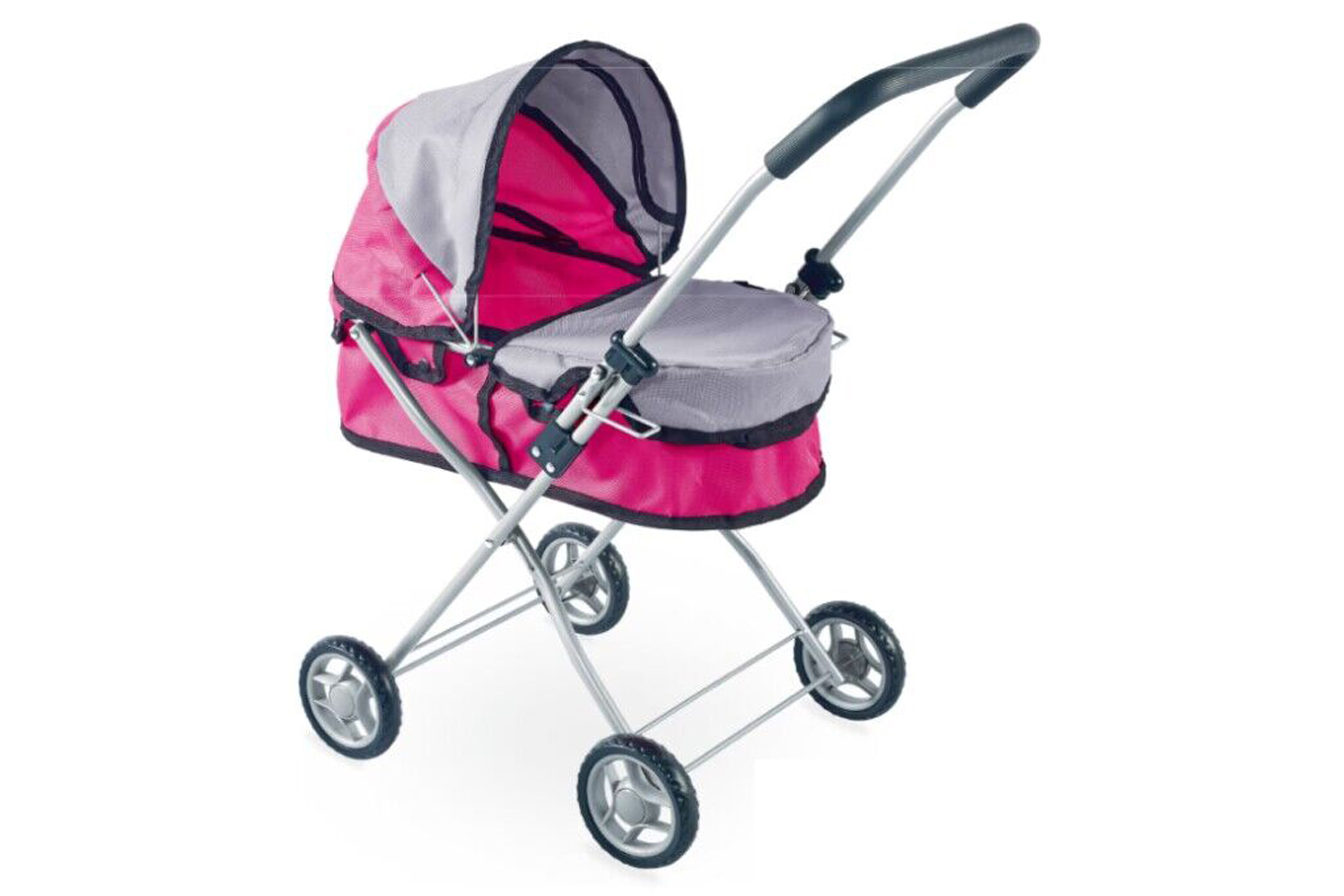 Kočárek pro panenku hluboký skládací. Rozměry 43x34x65 cm. Kovová konstrukce. Obsahuje papírový návod na smontování kočárku i na jeho složení pro převážení. Vhodný pro panenky o velikosti 43 cm.
