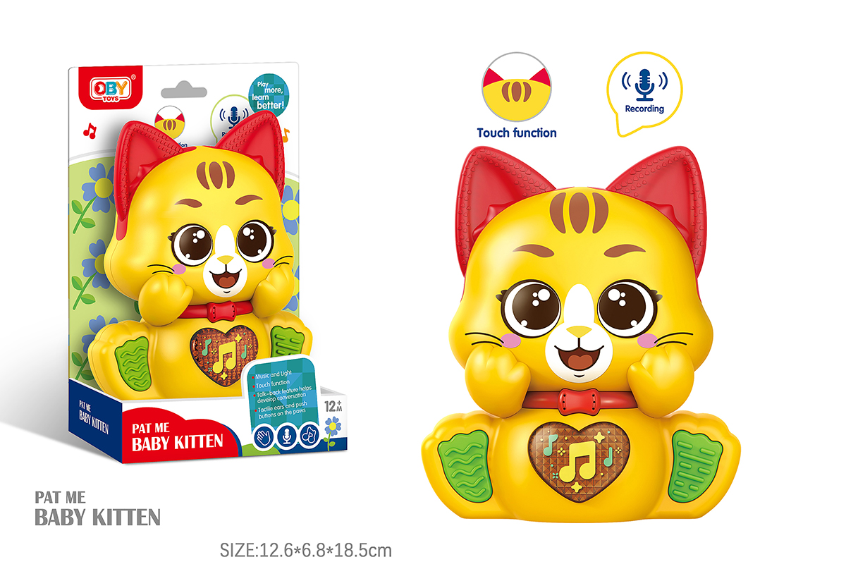 Kočka opakující s efekty. Rozměry 11,8x6,3x13,7 cm. Světelné a zvukové efekty. 2xAAA (1.5V) baterie nejsou součástí. Přepínač ON/OFF na zadní straně. Dotykem čela (horní části hlavy) nebo krátkým stiskem srdíčka - světelné a zvukové efekty. Dlouhý stisk srdíčka - opakuje, co říkám.