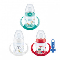 Kojenecká láhev na učení NUK First Choice s kontrolou teploty. Zabudovaný indikátor kontroly teploty změní barvu, pokud je obsah lahvičky příliš horký. Modrá barva indikátoru se změní na bílou. Lahvička miminkům usnadňuje přechod od kojení nebo krmení k samostatnému pití. Kojenecká láhev má měkké silikonové nekapající pítko a nemusíte se bát vylití obsahu. Je ergonomicky tvarovaná a má protiskluzová držátka, takže si dítě může láhev držet samo například i při jízdě v kočárku. Výhodou této super lahvičky je, že se snadno rozmontujete a čistí. Vyrobená z vysoko kvalitného plastu polypropylénu a neobsahuje BPA (Bisfenol A). Vhodné pro děti od 6 do 18 měsíců. Klinicky testováno. Balení obsahuje: