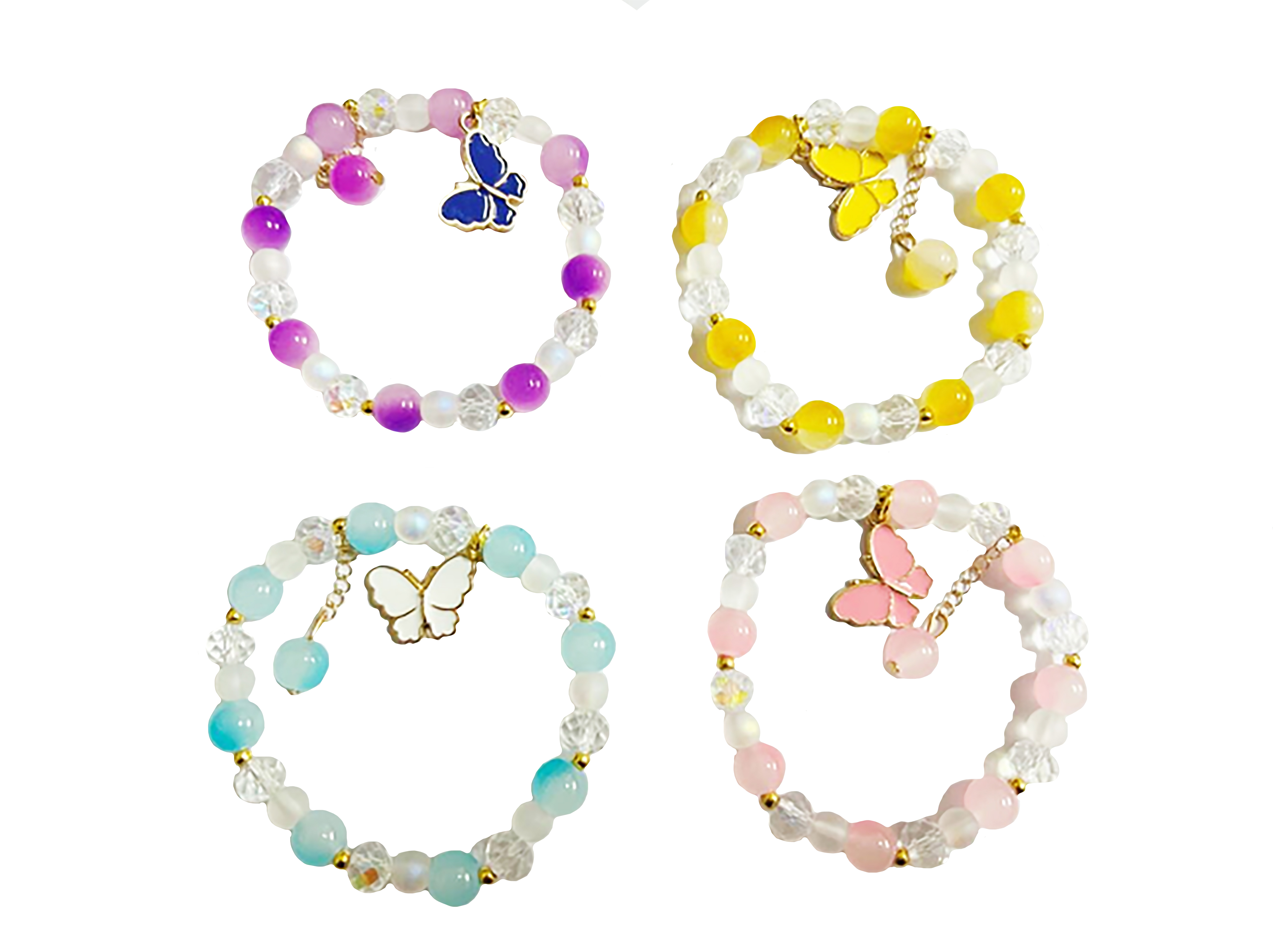 Korálkový náramek s motýlkem. Rozměry krabičky 19,5x19,5x5 cm. Display box 12 ks. 4 varianty - modrá, žlutá, bílá, růžová.
