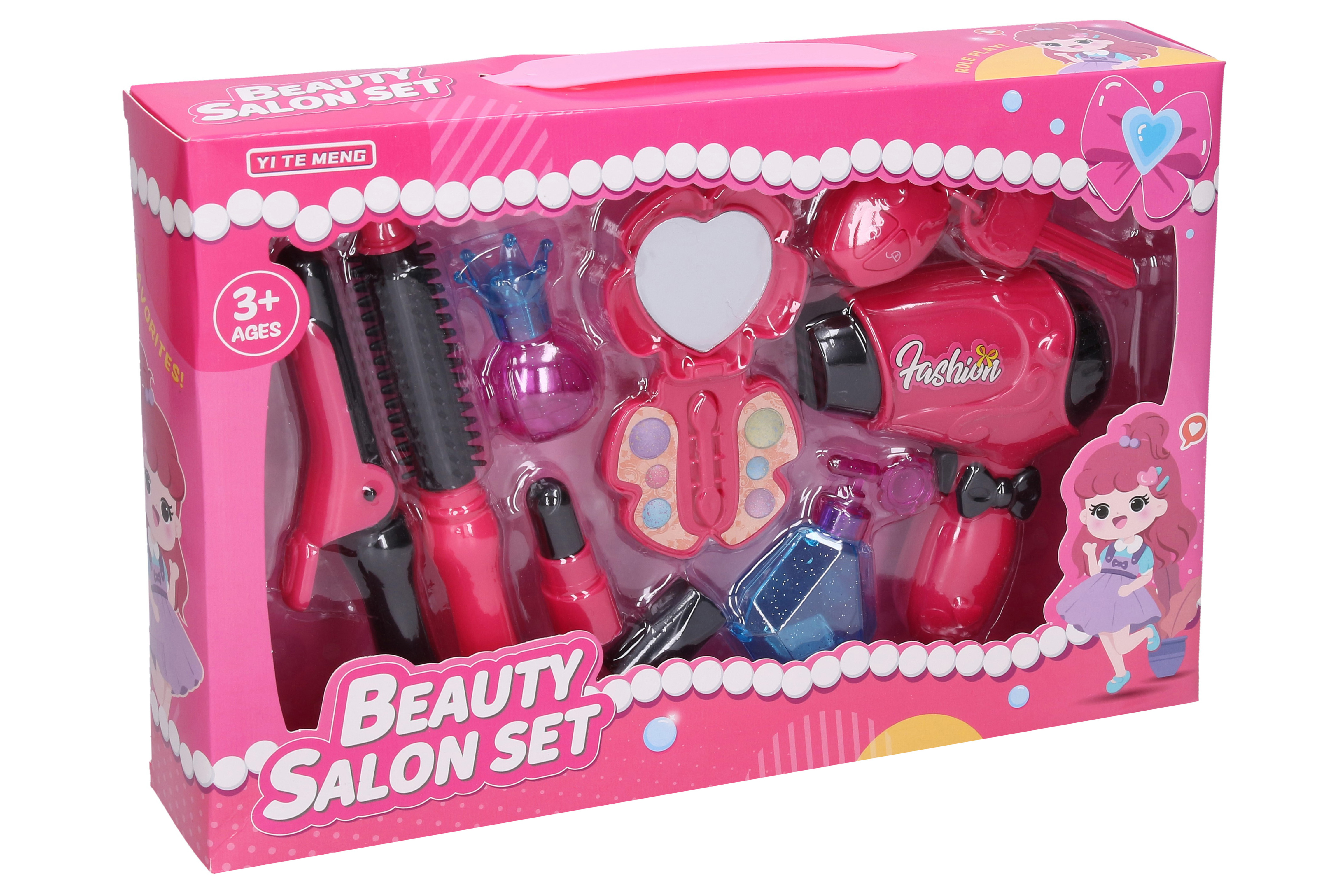 Kosmetický set s fénem. Velikost fénu 13cm. Obsahuje: fén, kulmu, kulatý kartáč na vlasy, zrcátko, klíče od auta, flakónky, rtěnku. 1xAA baterie není součástí.