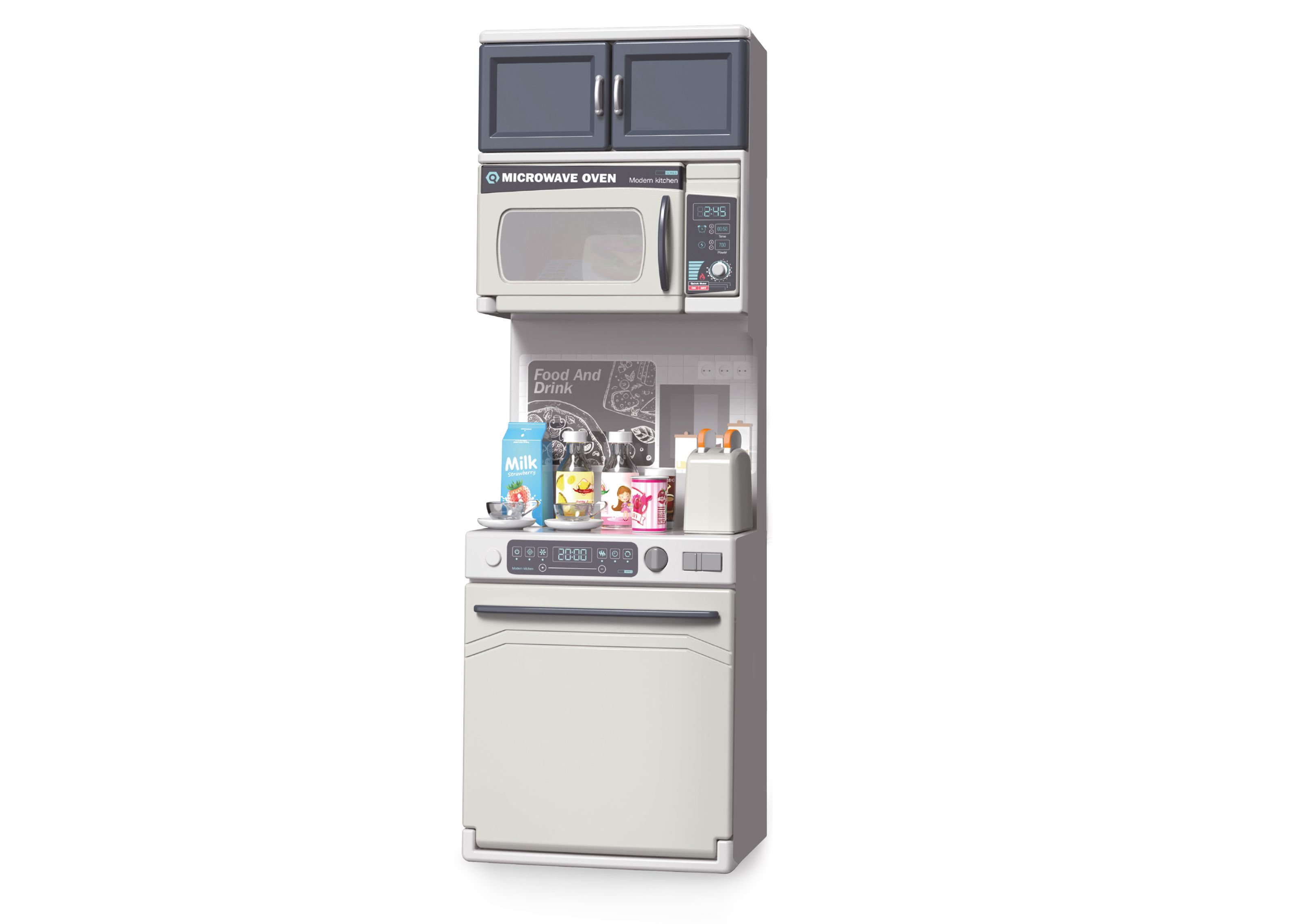 Kuchyňka s efekty. Rozměry 10,5x6,5x30 cm. Světelné a zvukové efekty tlačítkem na mikrovlnce. 3xAG13 baterie do mikrovlnky součástí. Obsah - myčka nádobí, mikrovlnka, skříňka, topinkovač, nádobí, jídlo, nápoje.