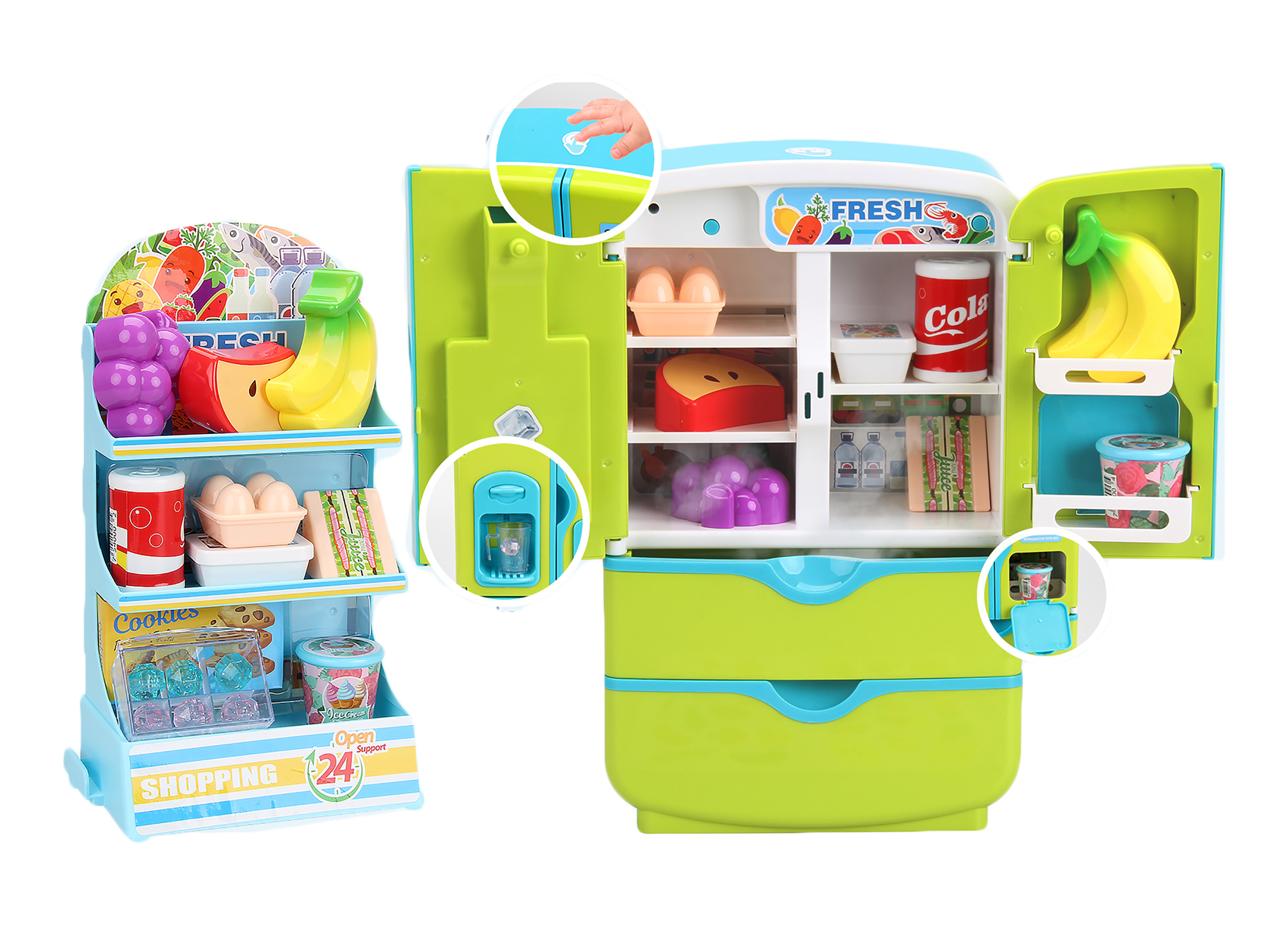 Lednička s regálem s potravinami. Velikost 28cm. Obsahuje lednici s dávkovačem ledu, nálepky na lednici, regál s potravinami. baterie 3xAA není součástí