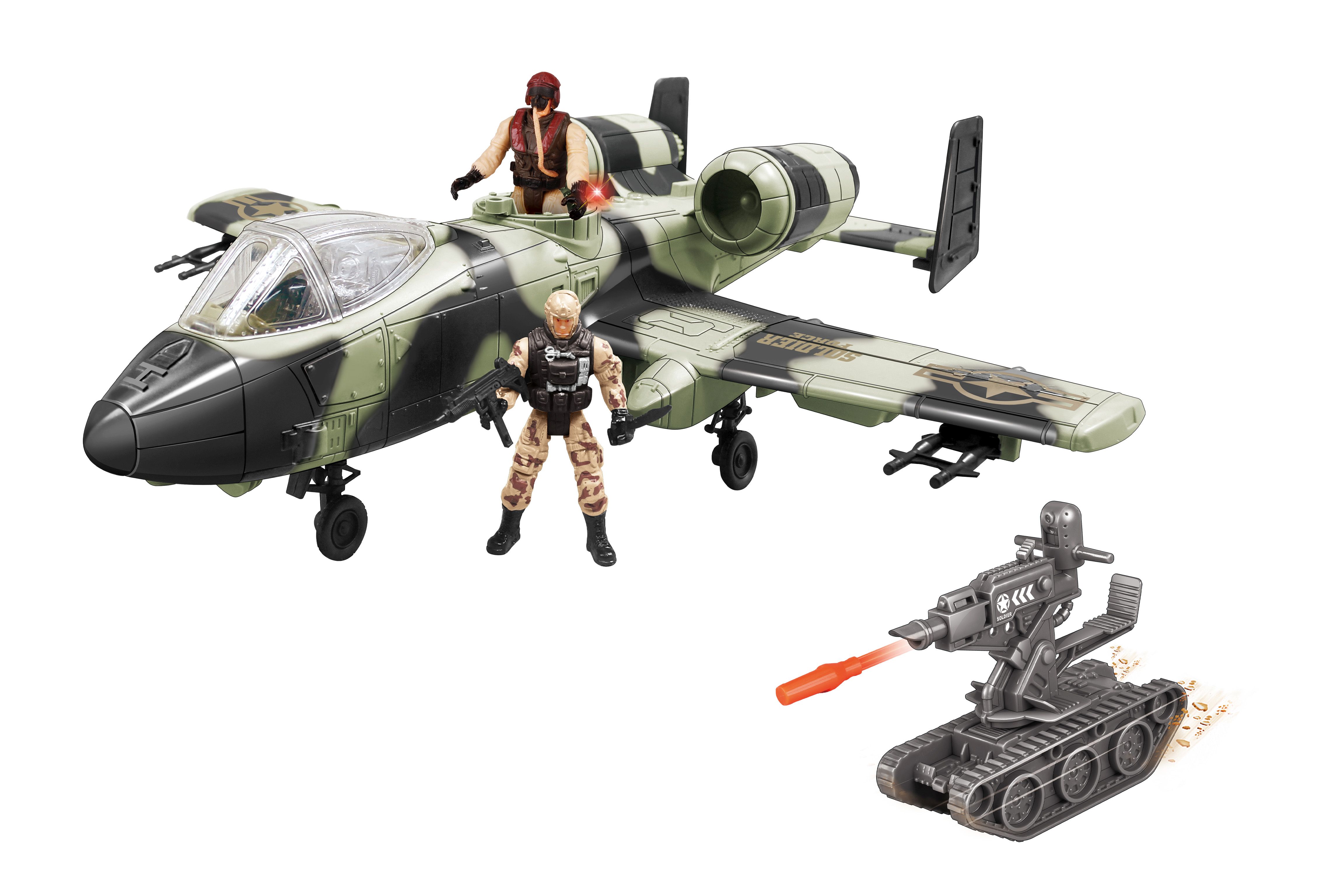 Letadlo s figurkami a efekty. Vozidlo střílející náboje a síť. Velikost letadla 48 cm, vojáků 10 cm. Světelné a zvukové efekty tlačítky na trupu před motory letadla. 2xAA baterie do letadla nejsou součástí. Obsah - letadlo, vozidlo, náboje, zbraně, 2 figurky vojáků. Obrázkový návod na používání na zadní straně obalu.
