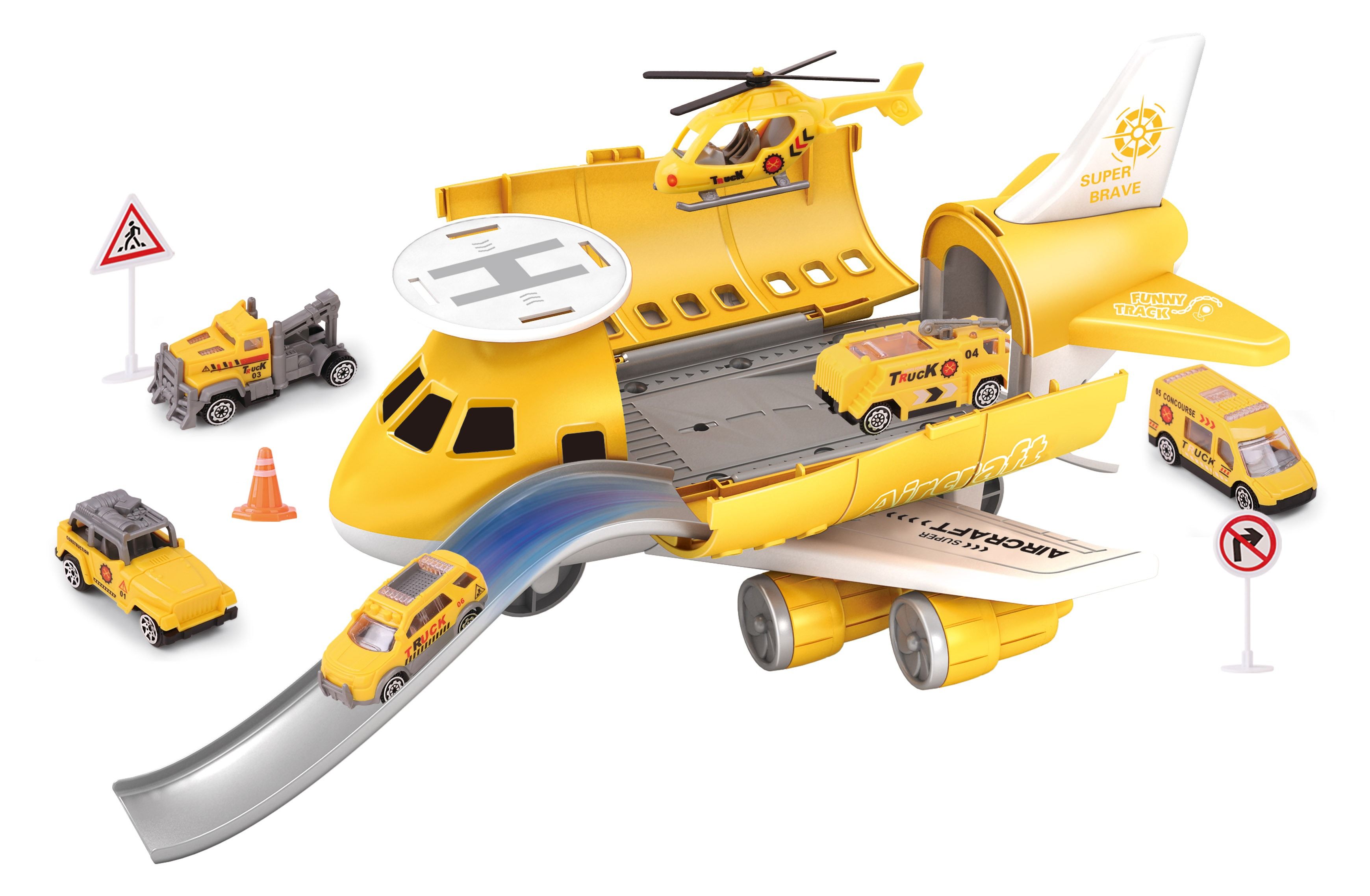 Letadlová stanice stavební. Rozměry 30x29x14 cm. Součástí 4 auta, 1 vrtulník. Volná kola. Obsahuje letadlovou stanici, 4 malé dopravní prostředky, dráhu, heliport, značky, kužely. Obrázek na sestavení na boční straně obalu.