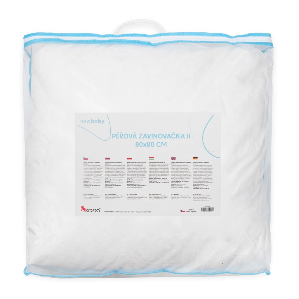 Luxusní péřová zavinovačka 80x80 bez prodlouženého cípu české značky New Baby je synonymem komfortu ve spaní. Péřová zavinovačka poskytuje miminku měkkoučký pocit, teplo a pocit bezpečí jako v bříšku. Pomáhá tak miminku se adaptovat na nové podmínky. Díky vynikajícím vlastnostem peří zajišťuje zavinovačka miminku stabilní teplotu. Peří absorbuje vlhkost a odvádí ji od lidského těla během spánku. Speciální čištěné, testované peří. Naše peřinky obsahují 80 procent ručně draného husího peří a 20 prachové peří výplně ( 0,3 kg),