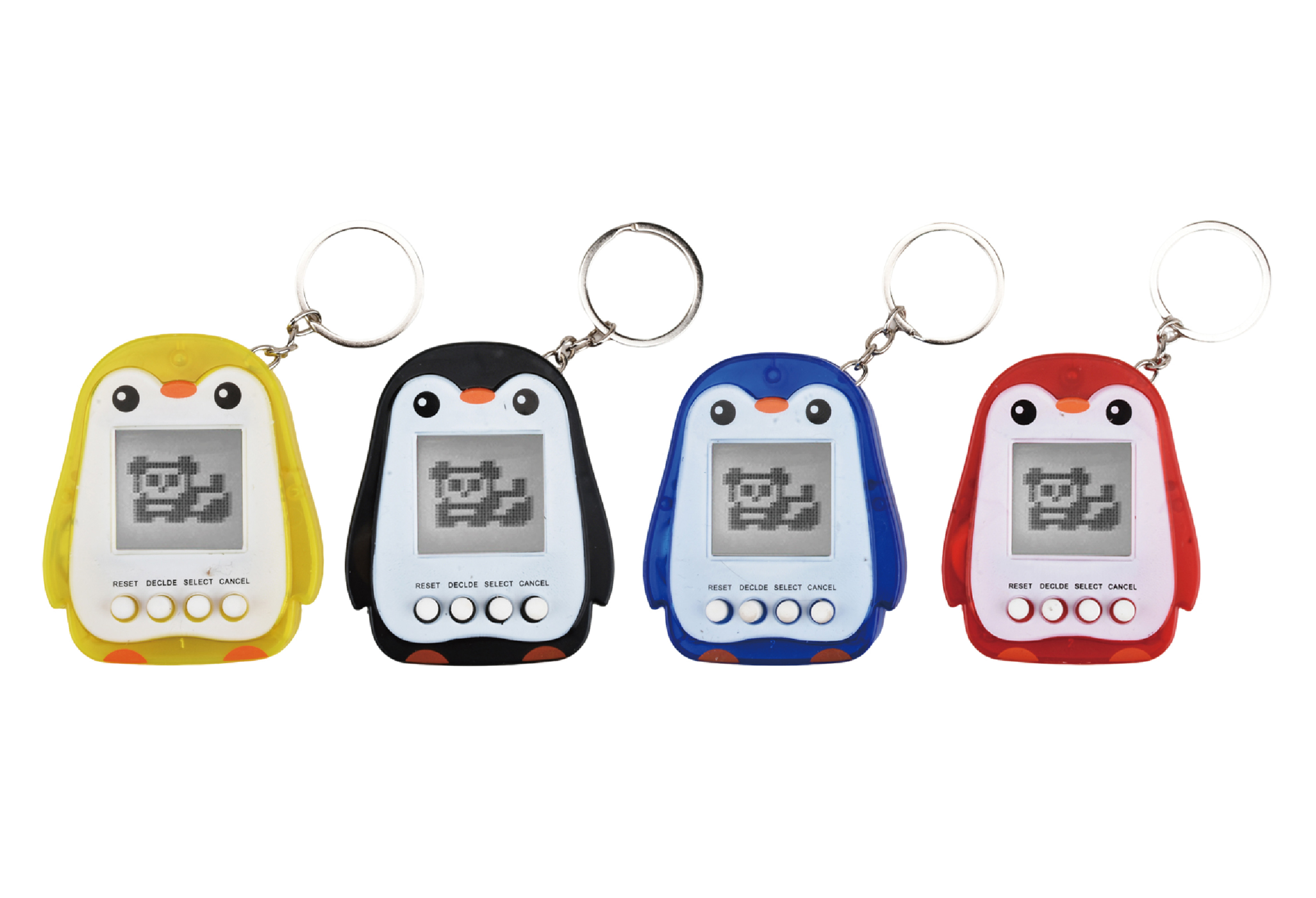 Mazlíček elektronický hra tučňák. Rozměry 7,4x6,1x2,6 cm. S kroužkem na klíče. Display box 12 ks. 4 varianty - žlutá, červená, modrá, černá. Baterie 2xAAA, nejsou součástí. Handheld herní konzole. Je možné si zvolit z velkého množství mazlíčků.