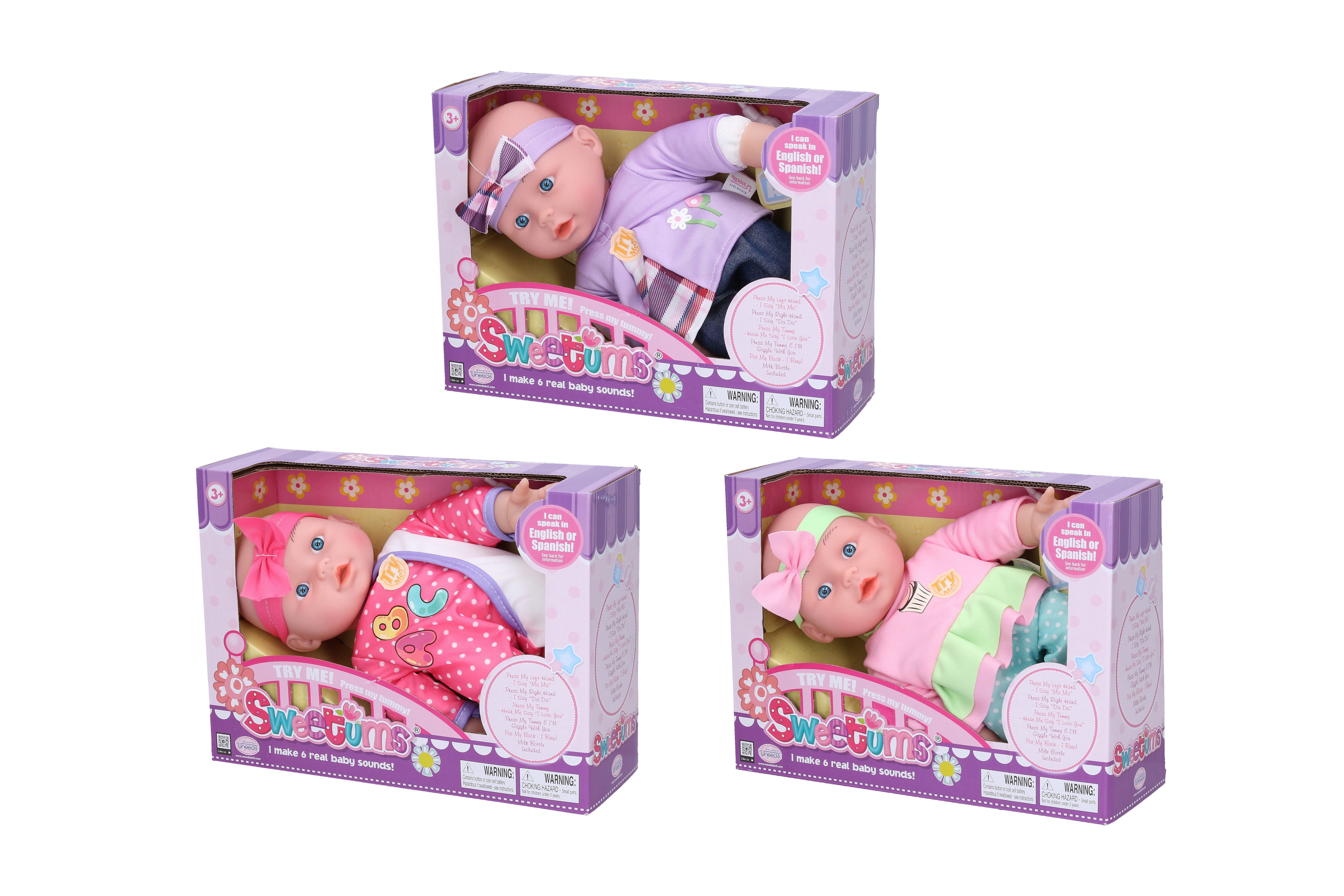 Miminko měkké mluvící. Velikost 28 cm. Součástí láhev. Stlačením levé dlaně říká "máma", stlačením pravé dlaně říká "táta", stlačením hrudníku říká "I love you" a směje se. 3xAG13 baterie součástí. 3 varianty.