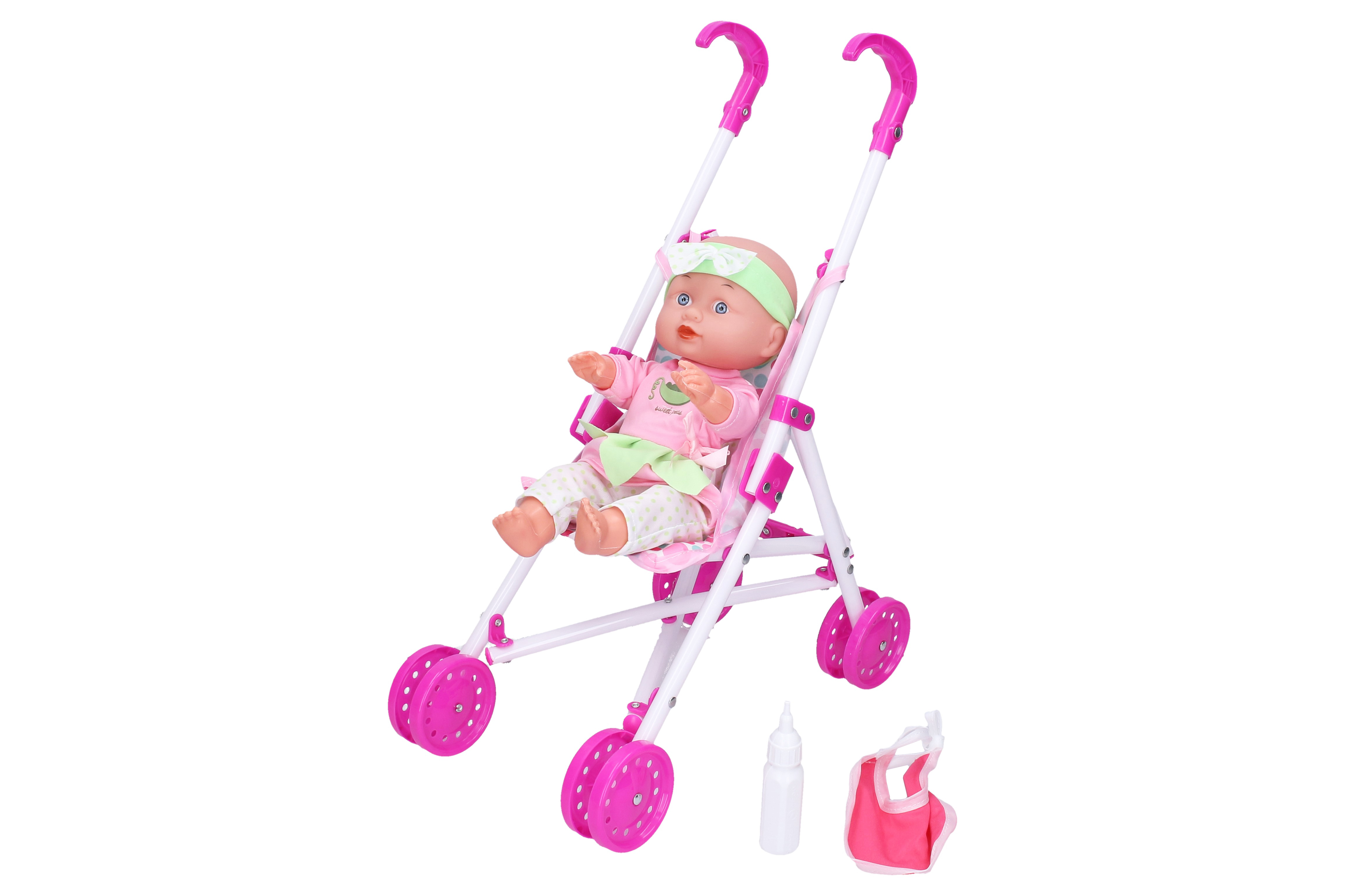 Miminko s kočárkem. Velikost 28 cm. Balení obsahuje miminko, složený kočárek, bryndáček a lahvičku.