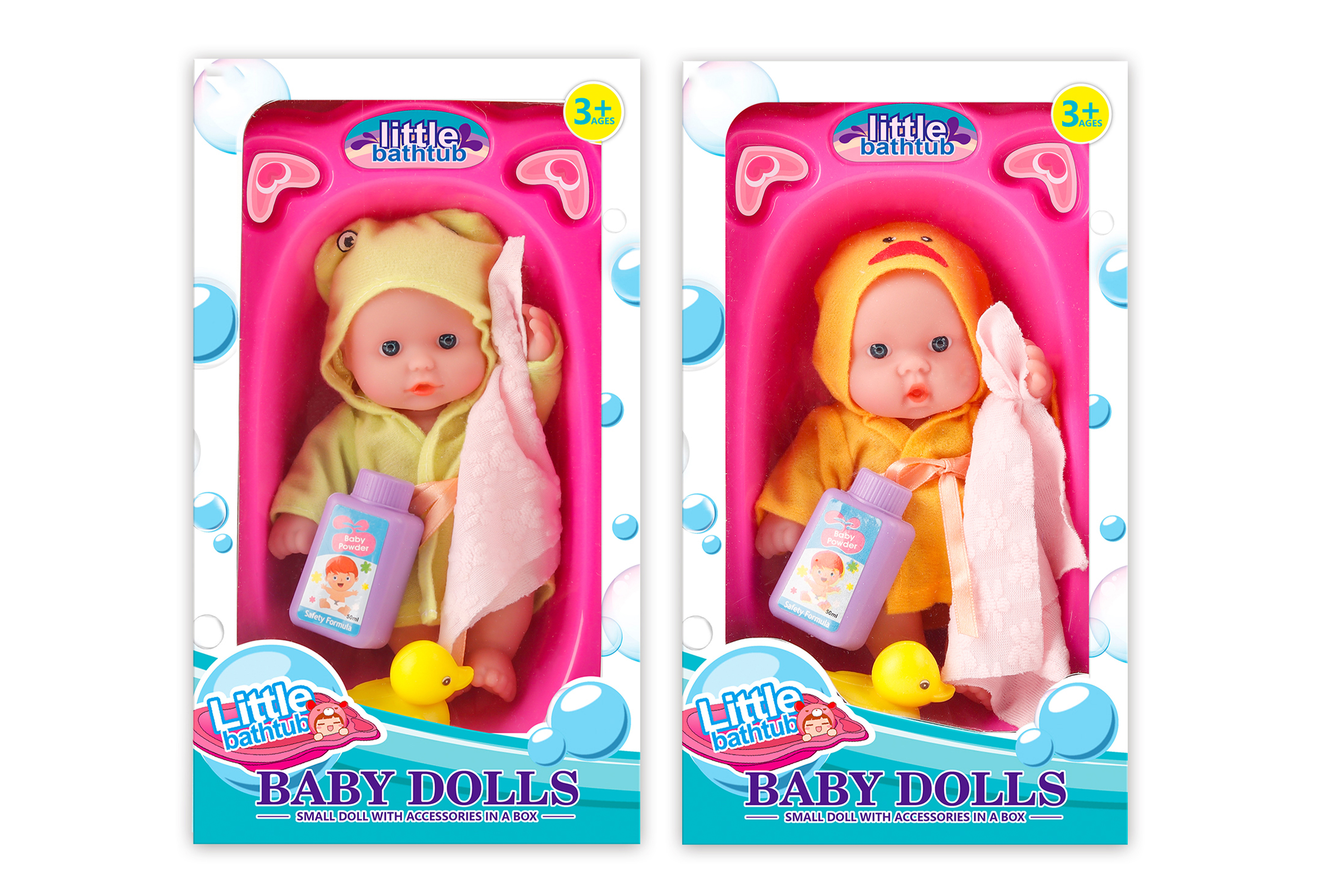 Miminko v oblečku s vaničkou set. Rozměry 15x6x26 cm. Obsah balení - miminko, vanička, obleček, příslušenství. 2 varianty - žába, kačenka.