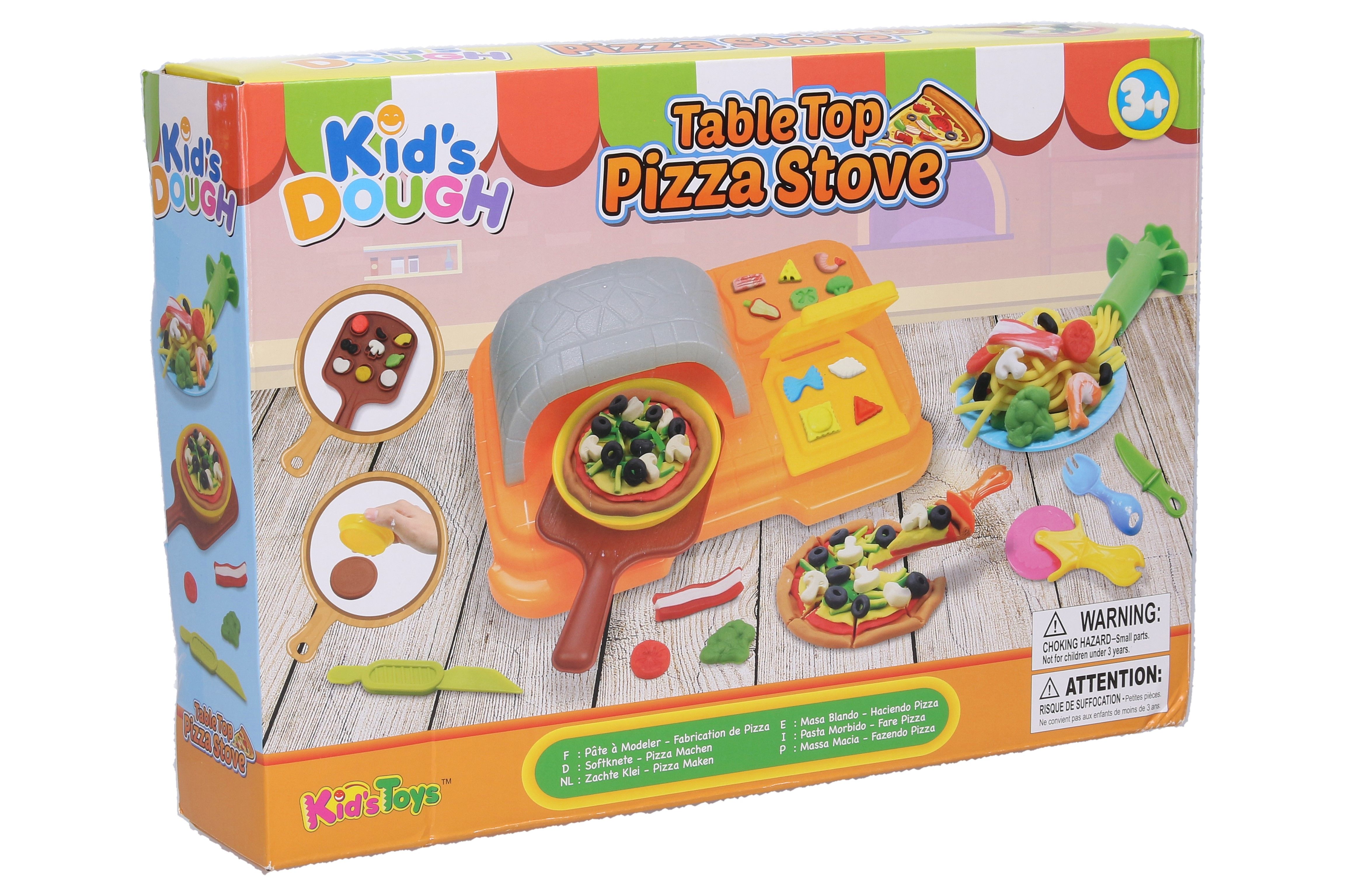 Modelovací hmota Pec na pizzu výtvarný set. Obsah balení - pec na pizzu s formičkami na přísady, nástroje na přípravu pizzy, tvarovací nástroje, lopatka na pizzu, 4x56g kelímky modelovací hmoty (červená, modrá, zelená, hnědá). Návod na míchání barev na zadní straně obalu.