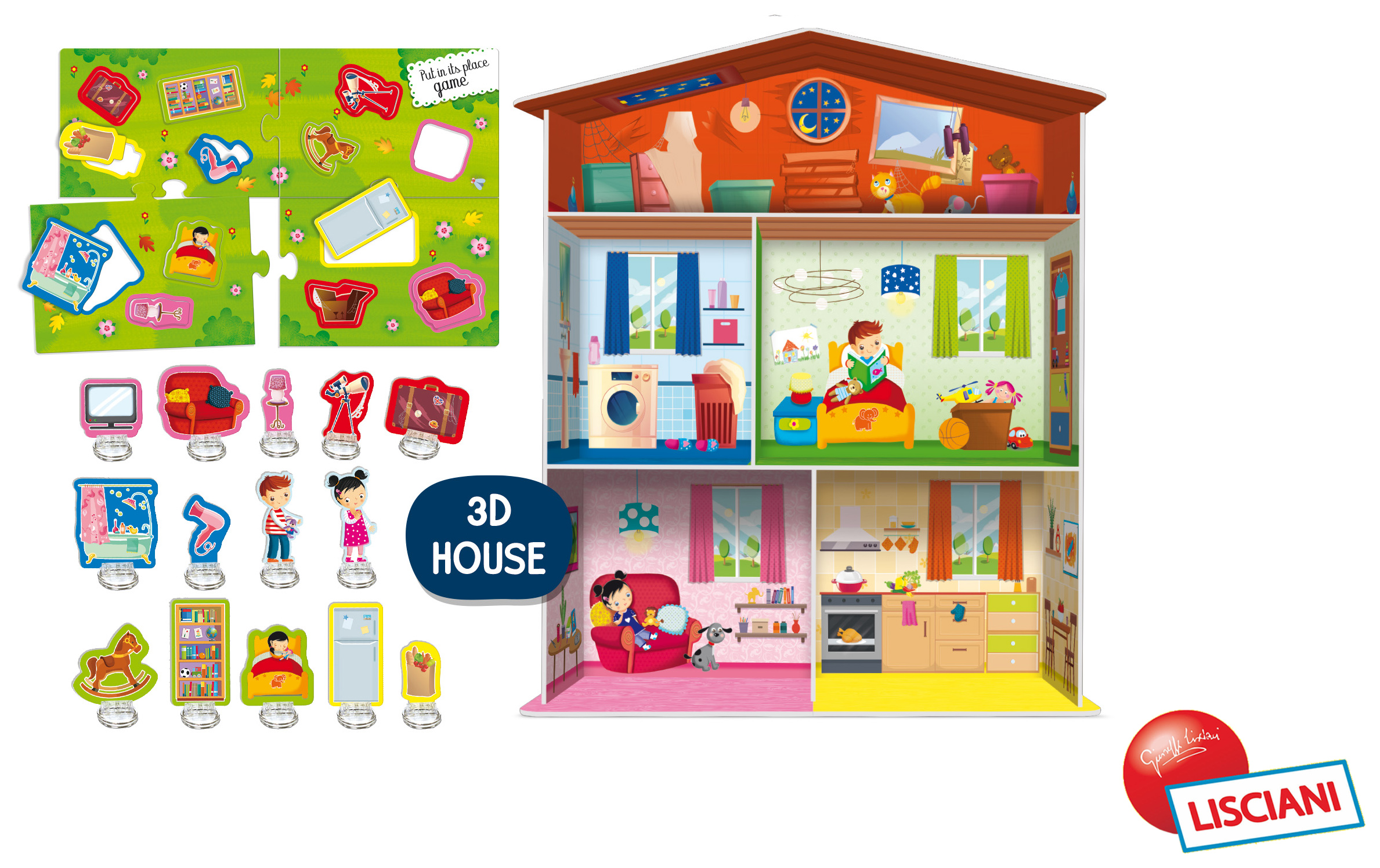 Obsah balení: domeček, puzzle ve tvaru vybavení, 15 stojánků na kartičky