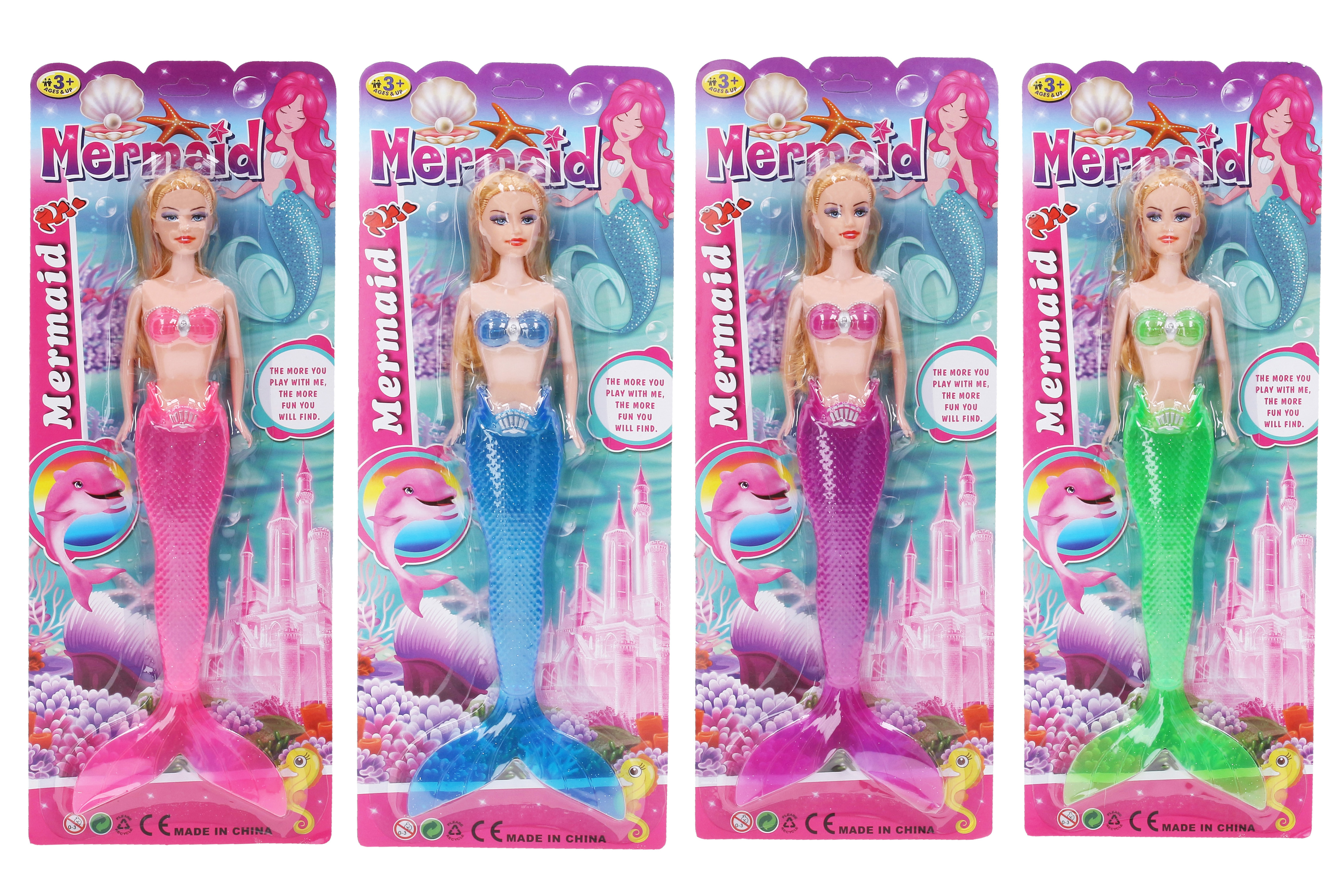 Mořská víla. Velikost 30 cm. Světelné efekty. Přepínač na zádech víly. 3xAG3 baterie nejsou součástí. 4 varianty - růžová, modrá, fialová, zelená.