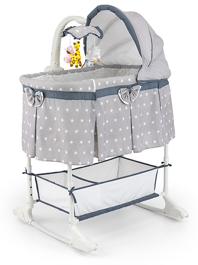 Krásná, dětská multifunkční kolébka a postýlka v jednom Milly Mally. Je vhodná pro miminka od prvních dnů života. Na spodní části houpacích lišt jsou kolečka, které je možné jednoduše nadzvednout a zablokovat, tím se kolébka změní na postýlku. Kolečka zaručují jednoduchou manipulaci s postýlkou. Díky veselému kolotoči s krásnými plyšovými hračkami, melodiemi a noční lampičkou bude usínání pro Vaše děťátko příjemnější. Praktickým dálkovým ovladačem lze jednoduše ovládat přehrávání melodií a světlo kolotoče. Výšku kolébky je možné nastavit do 4 poloh. Praktická stahovací bočnice usnadňuje přebalování miminka.