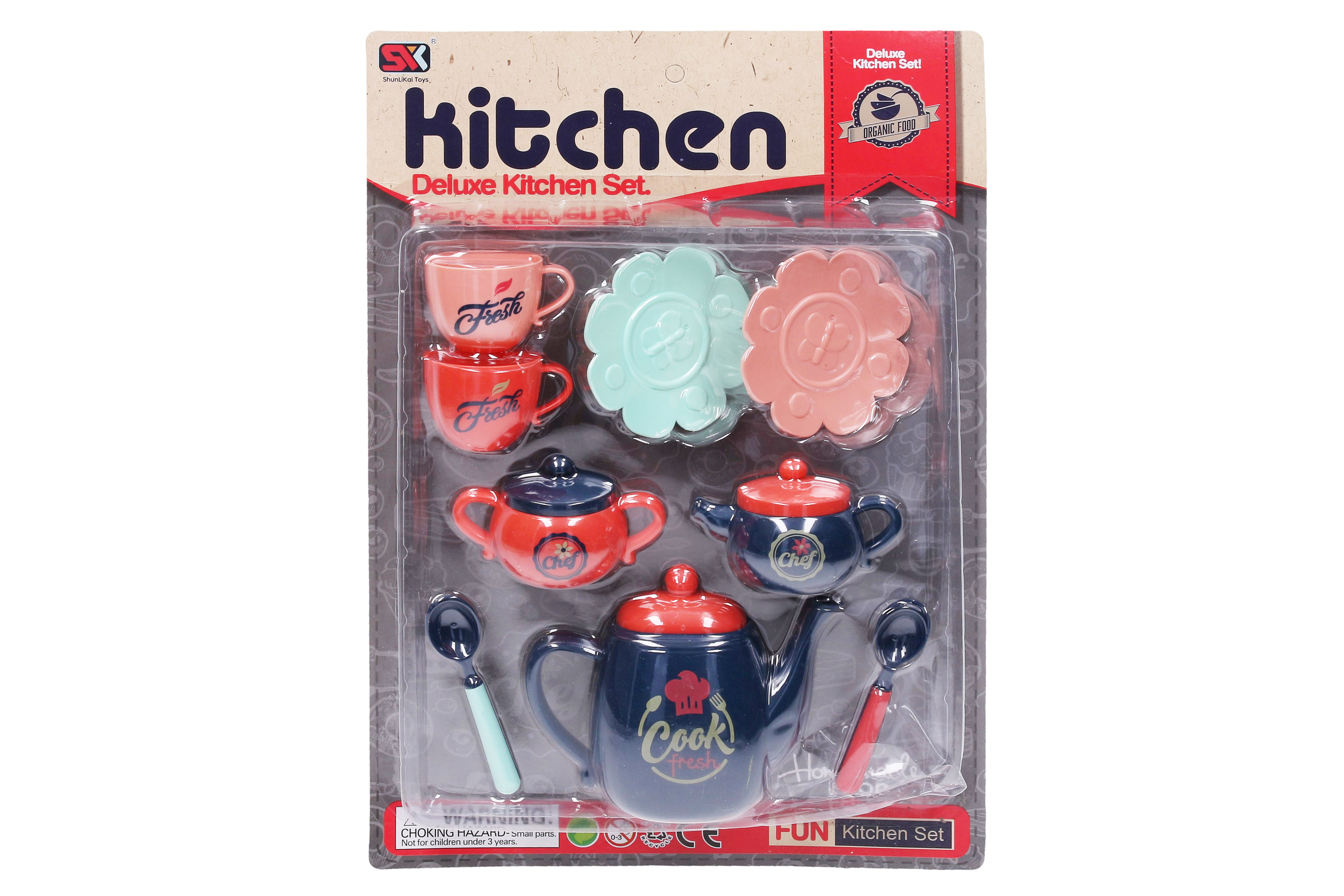 Nádobí čajový set. Součástí velká konvice, malá konvice, nádoba, 2 hrnky, 2 podšálky, 2 lžičky.
