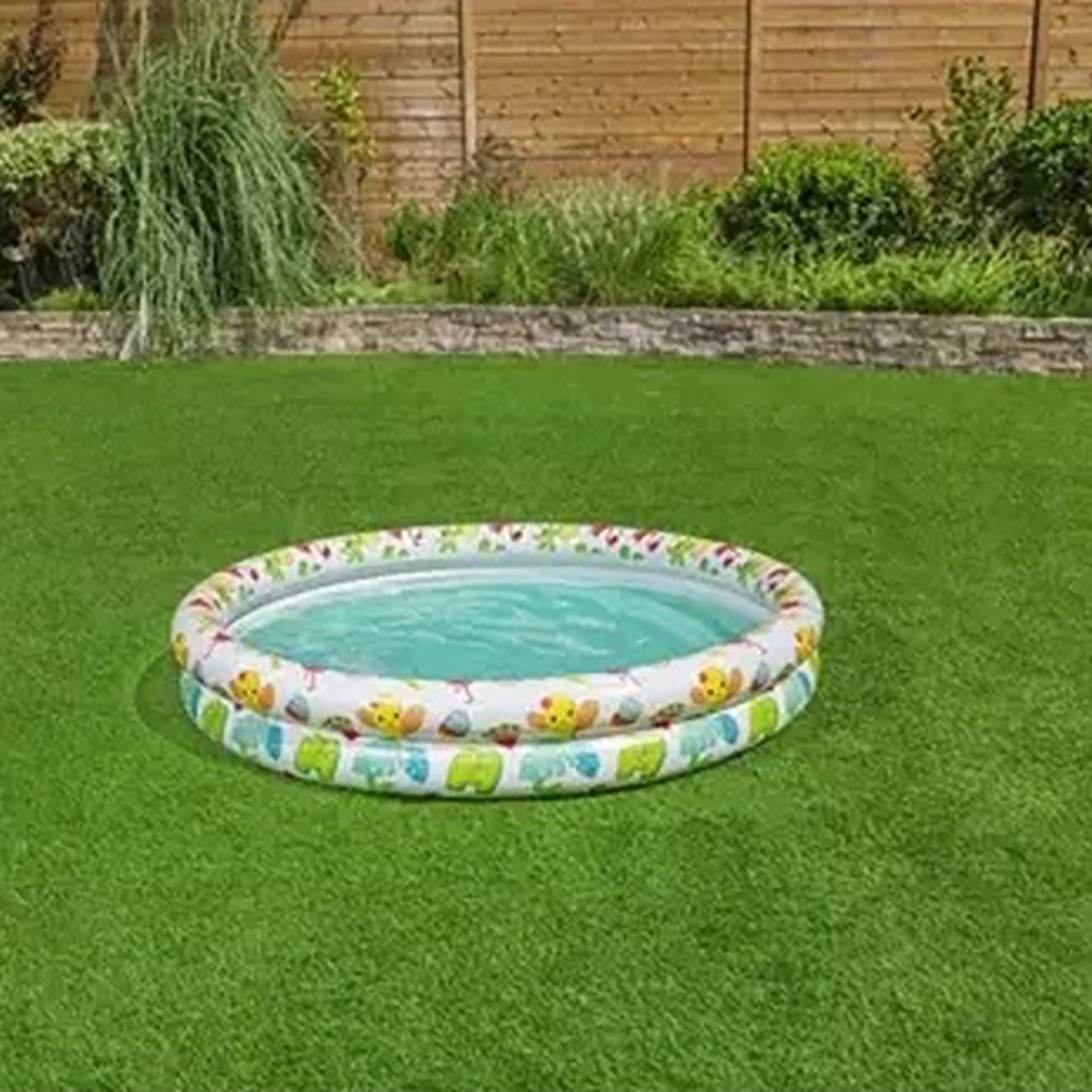 Praktická sada 3v1 obsahuje nafukovací dětský bazének o rozměrech 122 x 20 cm. Součástí jsou také dvě nafukovací hračky – míč o průměru 27 cm, vhodný jak do vody, tak na suchu, a plavací kruh o průměru 46 cm pro bezpečnější seznámení dítěte s vodou. Všechny prvky jsou ozdobeny veselým mořským motivem.