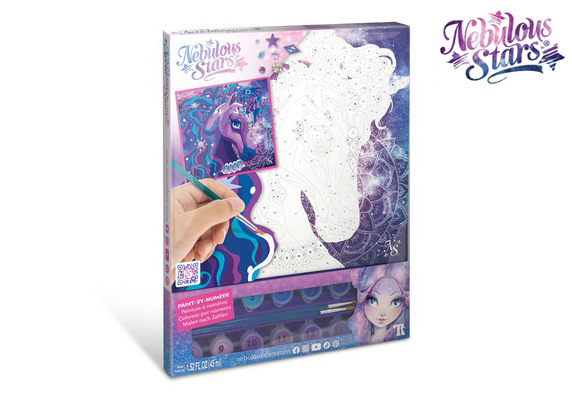 Nebulous Stars Malování podle čísel Nebulia a kůň. Obsah balení - tištěné plátno s dřevěným rámem, potištěné barevné plátno, 14 akrylových barev, 2 štětce, třpytivý lak, kamínky, instrukce, příběh Nebulie. Display box - 6 ks.