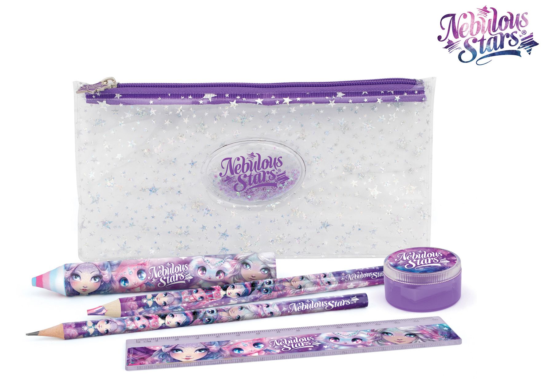 Nebulous Stars Sada na psaní. Sada obsahuje pouzdro, duhovou tužku, tužku, gumu, pravítko, ořezávátko. Display box - 10 ks.