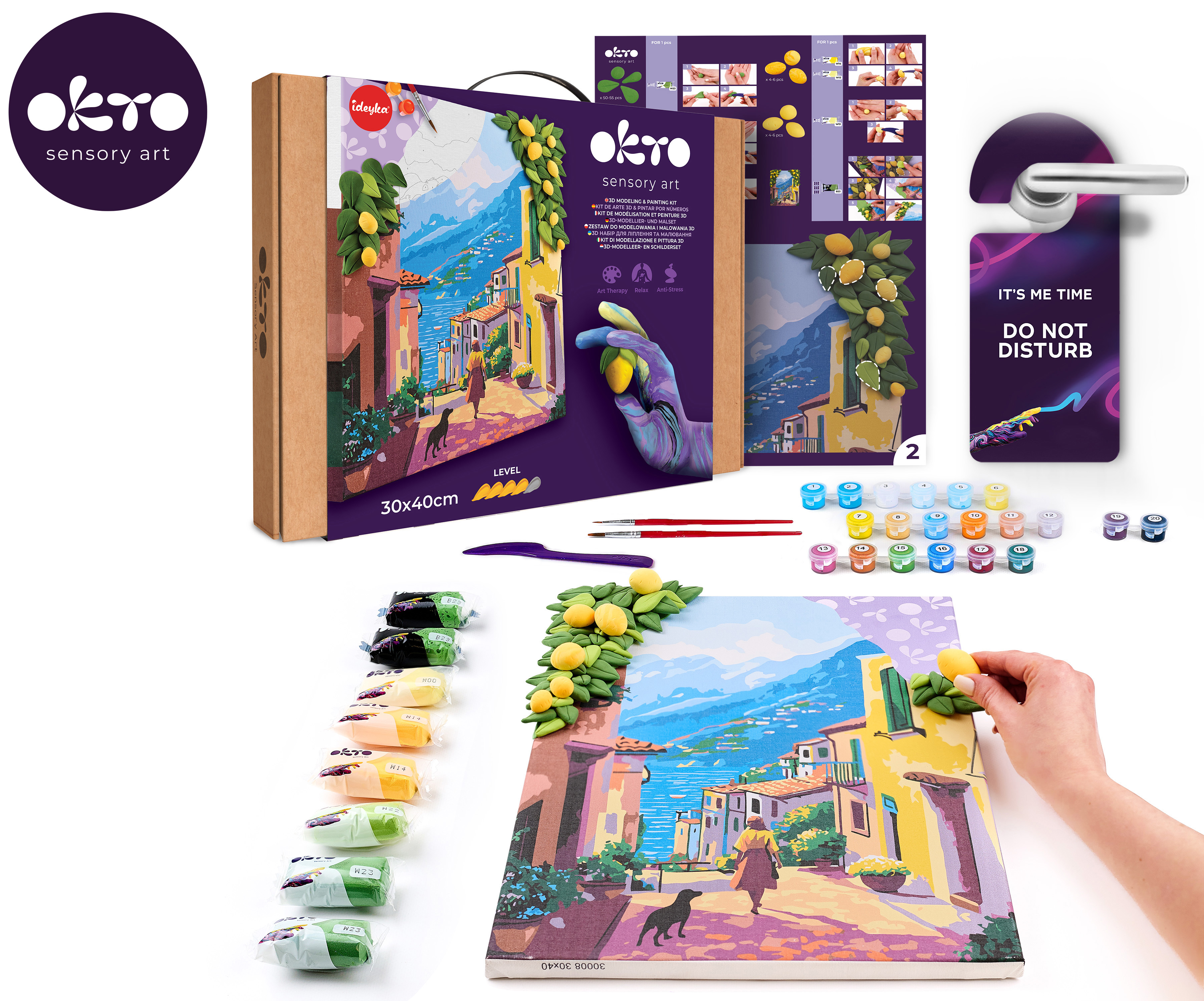 OKTO Malba a 3D modelování obraz "Lemon Weekend". Velikost plátna 30x40 cm. Vymalujte obrázek podle čísel a vytvarujte 3D prvek obrazu. Obsah balení - plátno, obrázkový návod, modelovací nástroj, Sada samoschnoucí modelovací hmoty, set barev na malování, štětec.