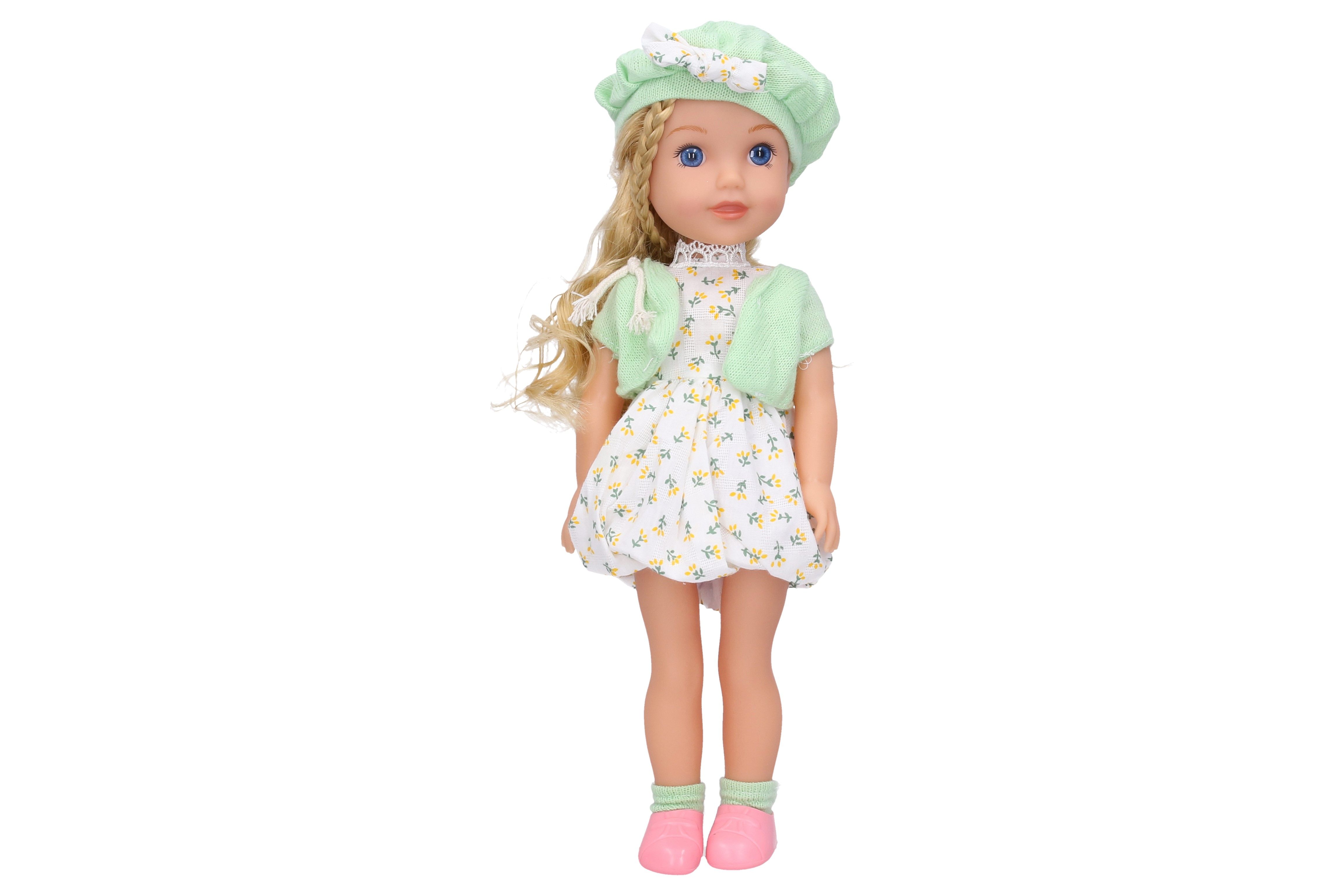 Panenka s kabelkou, čepicí a zvukovými efekty. Velikost 36 cm. Zvukové efekty stiskem bříška. 3xAG13 baterie součástí. Součástí hřeben a kabelka.
