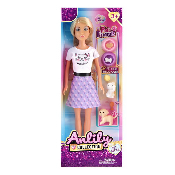 Panenka s příslušenstvím. Velikost 30 cm. Součástí pejsek, kočka, misky se žrádlem a hračky.