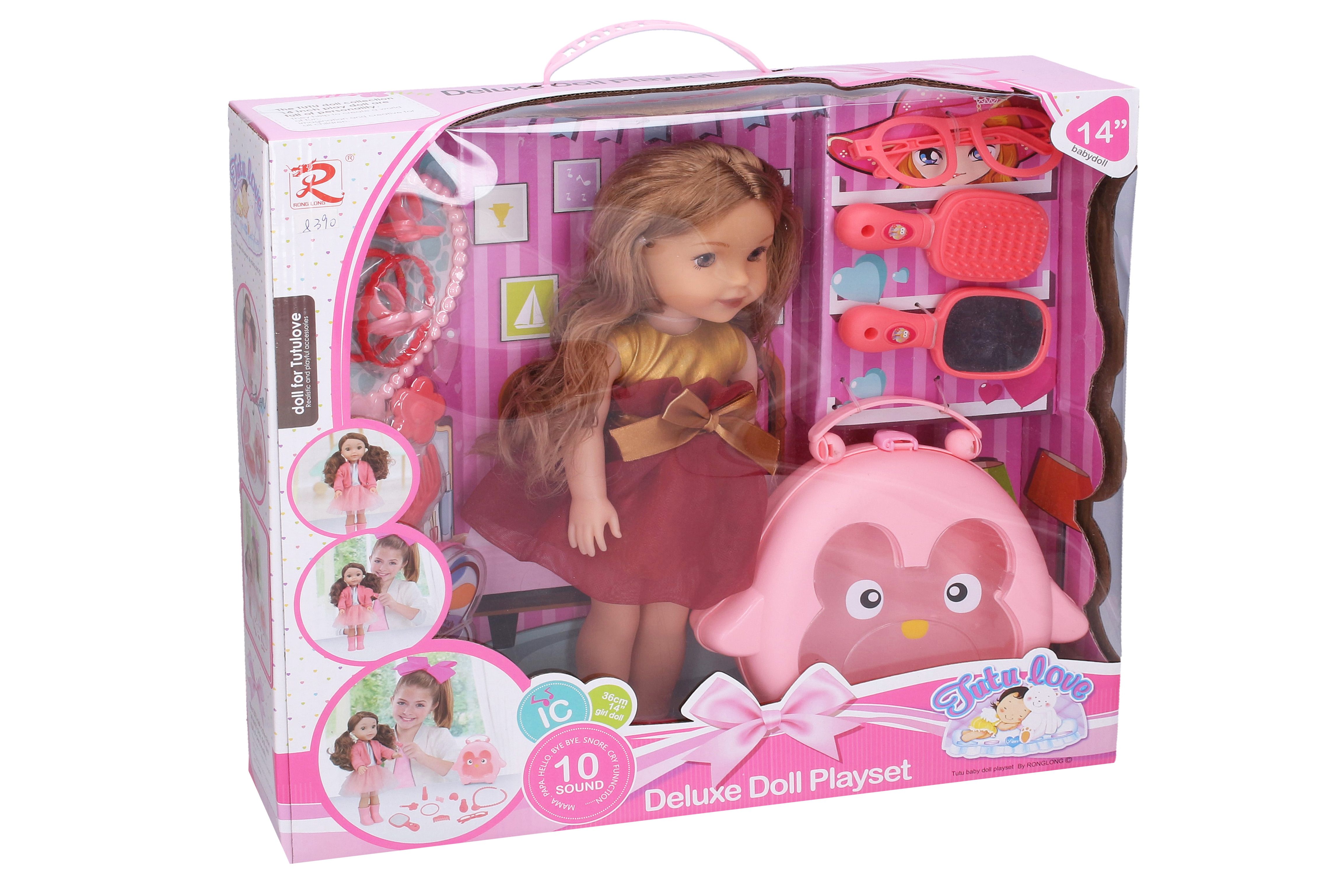 Panenka s příslušenstvím. Velikost 35cm. Zvukové efekty. Obsahuje panenku, příslušenství pro panenku i pro holčičku, kabelku na uložení příslušenství. 3xAG13 baterie součástí.