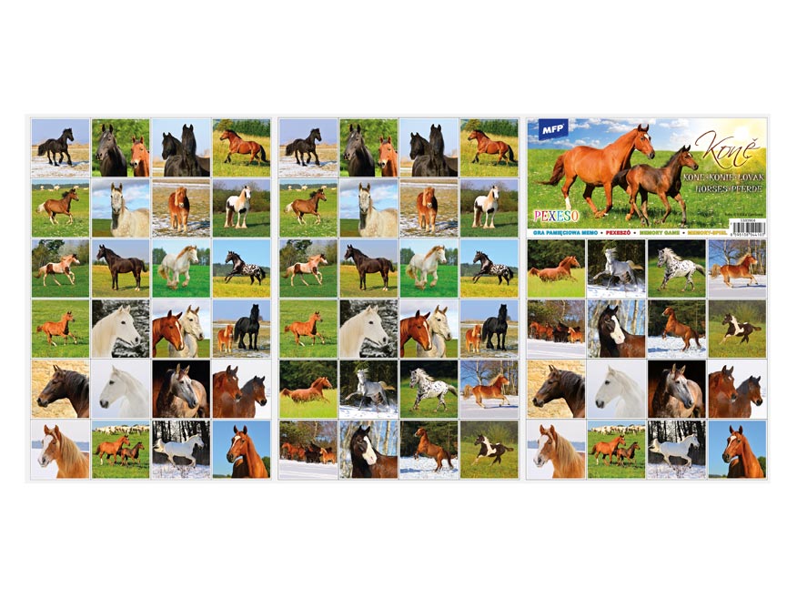 PEXESO je populární dětská stolní hra, která nikdy neomrzí a zapojit se můžou i dospělí. Pexeso - Koně - je vhodné pro milovnice a milovníky koní. Věděli jste, že slovo PEXESO vzniklo souslovím slov PEKELNĚ SE SOUSTŘEĎ? Výborná učební pomůcka pro děti a rodiče. Naučte své děti poznávat zvířata a procvičujte jejich paměť. Tato hra je zabaví na dlouhé hodiny.Pexeso se skládá ze tří A4, na kterých najdete 64 kartiček s obrázky koní a návod ke hře.NÁVOD KE HŘE PEXESO:Pexeso mohou hrát nejméně dva hráči. Všechny rozstříhané kartičky zamíchají a rozloží obrázkem dolů do čtverce 8 x 8 kartiček. Nesmí se při tom dívat na obrázek. Hráči si určí pořadí hry. Hráč otočí dvě libovolné kartičky tak, aby si i ostatní spoluhráči mohli obrázky a jejich umístění zapamatovat. Pokud nemají kartičky stejné obrázky, otočí je a vrátí na původní místo. Pokračuje další hráč, který je na řadě. Jestliže objeví stejné obrázky, získává bod a obě kartičky vyřadí ze hry. Pokračuje do té chvíle, kdy otočí dva různé obrázky. Vyhrává hráč, který získá více bodů.PAPÍR: křída matná 350g + lamino lesk 1/1VELIKOST HRACÍCH KARET: 51x51cmVAROVÁNÍ:Nevhodné pro děti do 3 let. Nebezpečí vdechnutí a spolknutí malých částic.Uvedená cena je za 1 ks.