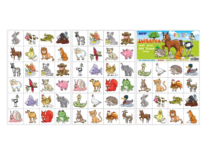 PEXESO je populární dětská stolní hra, která nikdy neomrzí a zapojit se můžou i dospělí. Věděli jste, že slovo PEXESO vzniklo souslovím slov PEKELNĚ SE SOUSTŘEĎ? Výborná učební pomůcka pro děti a rodiče. Naučte své děti poznávat zvířata a procvičujte jejich paměť. Tato hra je zabaví na dlouhé hodiny.Pexeso se skládá ze tří A4, na kterých najdete 64 kartiček malovaných zvířat a návod ke hře.NÁVOD KE HŘE PEXESO:Pexeso mohou hrát nejméně dva hráči. Všechny rozstříhané kartičky zamíchají a rozloží obrázkem dolů do čtverce 8 x 8 kartiček. Nesmí se při tom dívat na obrázek. Hráči si určí pořadí hry. Hráč otočí dvě libovolné kartičky tak, aby si i ostatní spoluhráči mohli obrázky a jejich umístění zapamatovat. Pokud nemají kartičky stejné obrázky, otočí je a vrátí na původní místo. Pokračuje další hráč, který je na řadě. Jestliže objeví stejné obrázky, získává bod a obě kartičky vyřadí ze hry. Pokračuje do té chvíle, kdy otočí dva různé obrázky. Vyhrává hráč, který získá více bodů.PAPÍR: křída matná 350g + lamino lesk 1/1VELIKOST HRACÍCH KARET: 51x51cmVAROVÁNÍ:Nevhodné pro děti do 3 let. Nebezpečí vdechnutí a spolknutí malých částic.Uvedená cena je za 1 ks.