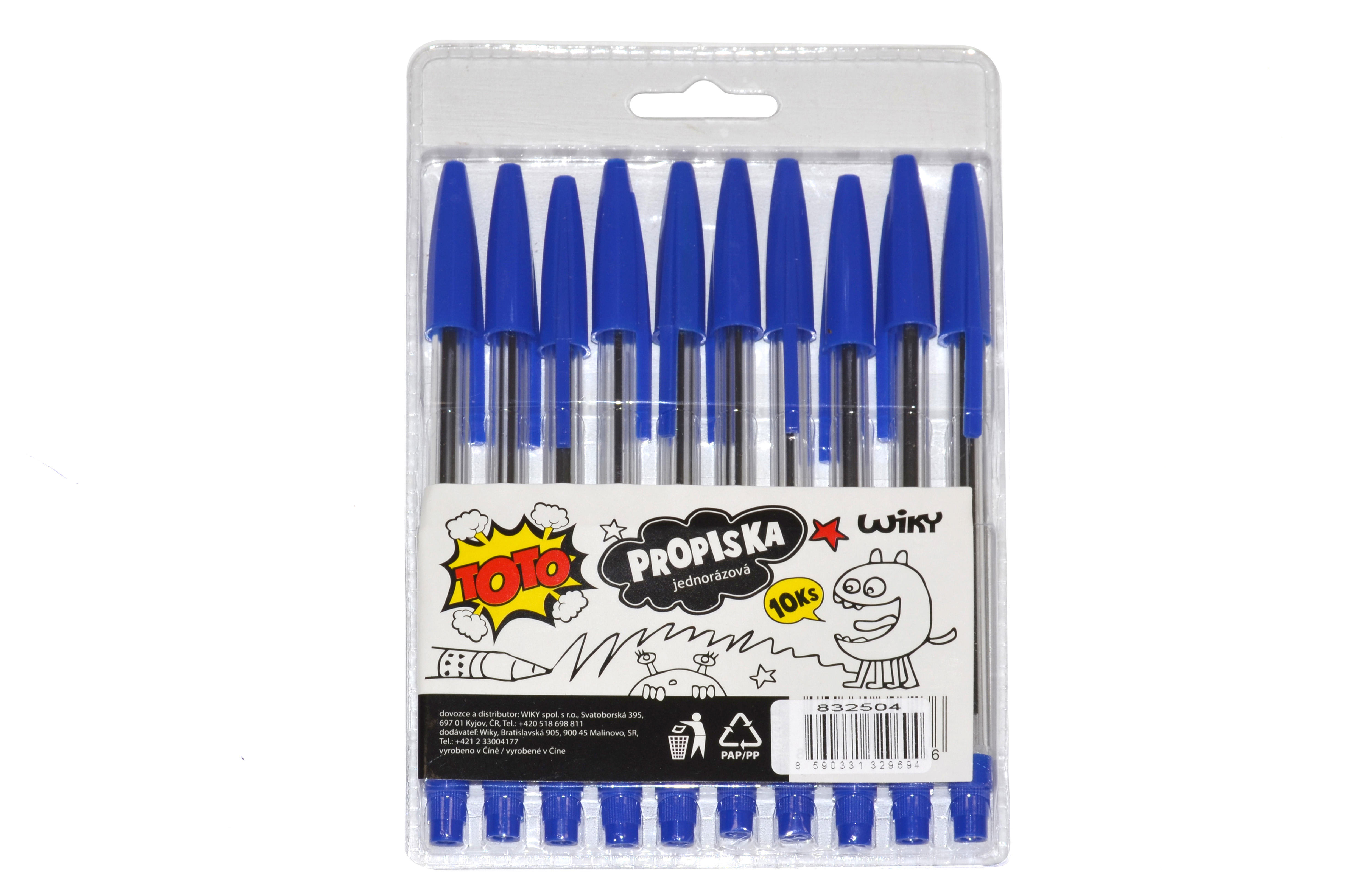 Sada modrých jednorázových propisek značky TOTO pro psaní ve škole nebo volném čase.
