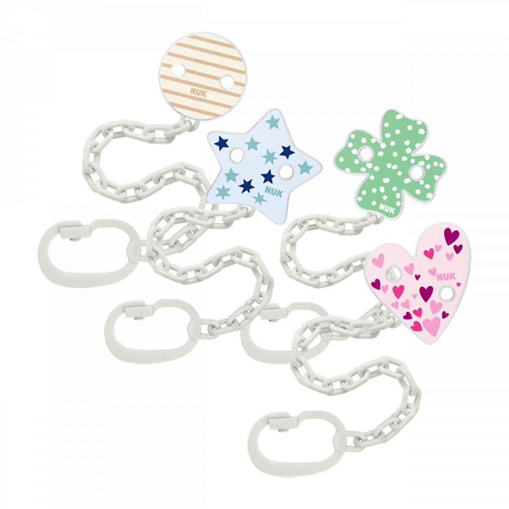 Veselý, barevný řetízek na dudlík NUK, je skvělým pomocníkem pro miminka i rodiče. Nenahraditelný zvláště během cestování a procházek. Díky sponě dudlík nespadne na zem a nezašpiní se, a neztratí se. Má jednoduché použití a je vyroben tak, aby se dal připnout k dětskému oblečení. Pestré barvy a veselé obrázky dítě zaujmou. Určeno pro děti od prvních dnů života. Vhodný pro šidítka s kroužkem.