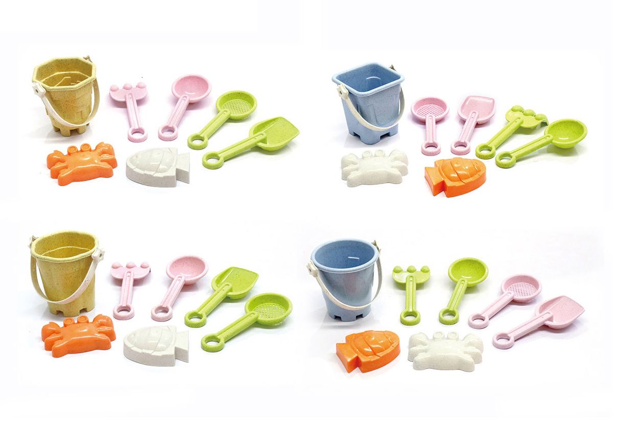 Sada na písek 7 ks. Součástí kbelík, 2 lopatky, sítko, hrabičky, 2 formičky.