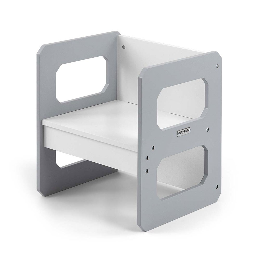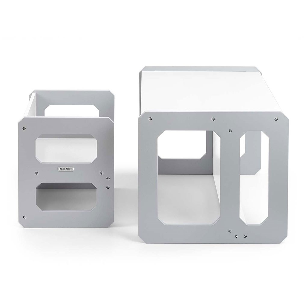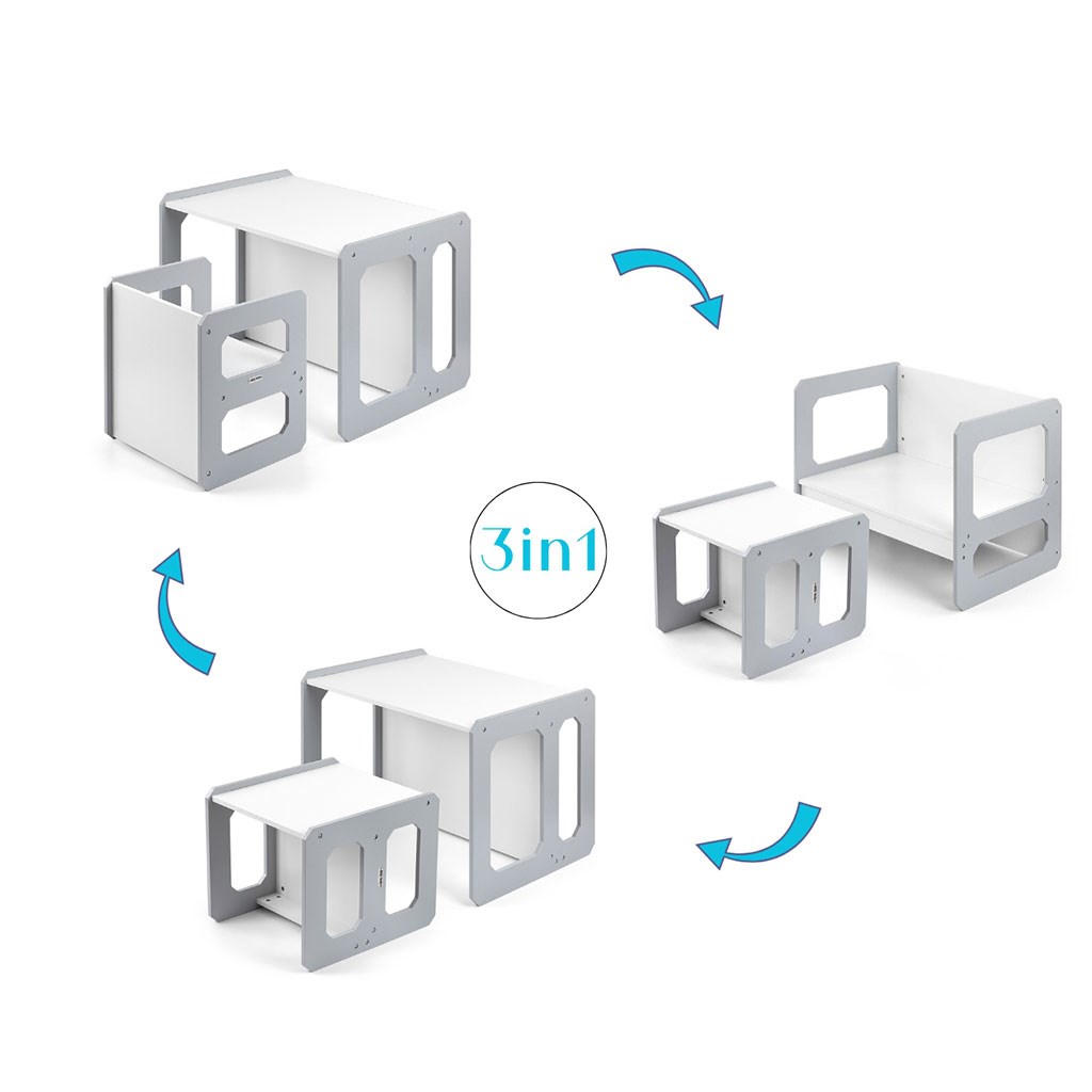 Sada nábytku 3v1 Stella v barevné kombinaci bílé a šedé se šedými doplňky, navržená s ohledem na zajištění dětem: pohodlí, prostoru pro kreativní hraní, malování, psaní a maximálního komfortu během činností.