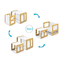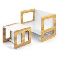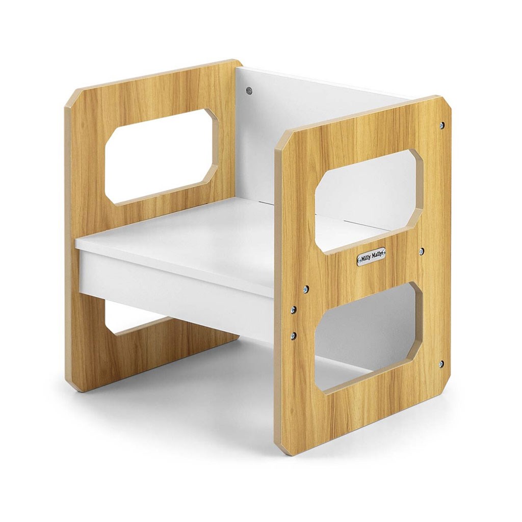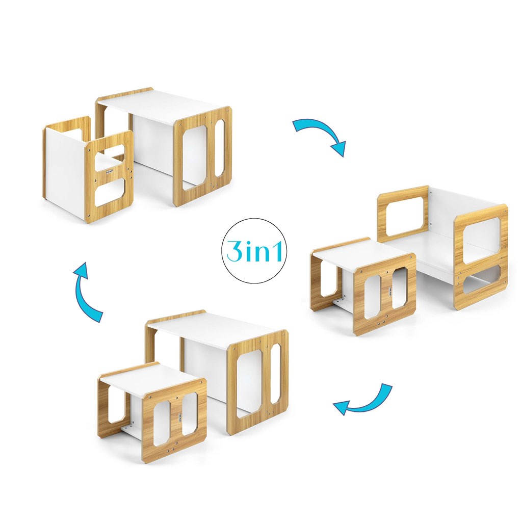 Sada se skládá z jednoho stolku a jedné židličky, které díky modulární konstrukci mohou plnit různé funkce – stolek lze proměnit ve větší sedadlo a židlička se dokonale hodí jako menší stolek nebo sedátko bez opěradla pro starší dítě. Díky své lehké konstrukci je tento nábytek snadno přenosný, což umožňuje dětem přizpůsobit si ho podle svých potřeb.