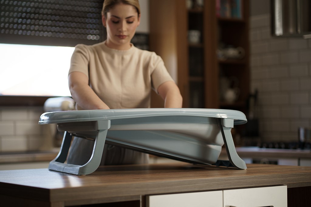 Vanička je vybavena výpustním ventilem a páskovým teploměrem, což výrazně zvyšuje komfort a bezpečnost při každodenním používání. Dá jednoduše složit na výšku pouhých 10 cm, přičemž plastové nožičky se sklopí přímo pod vaničku – díky čemuž zabírá minimum místa a je ideální pro skladování i v menších prostorách.