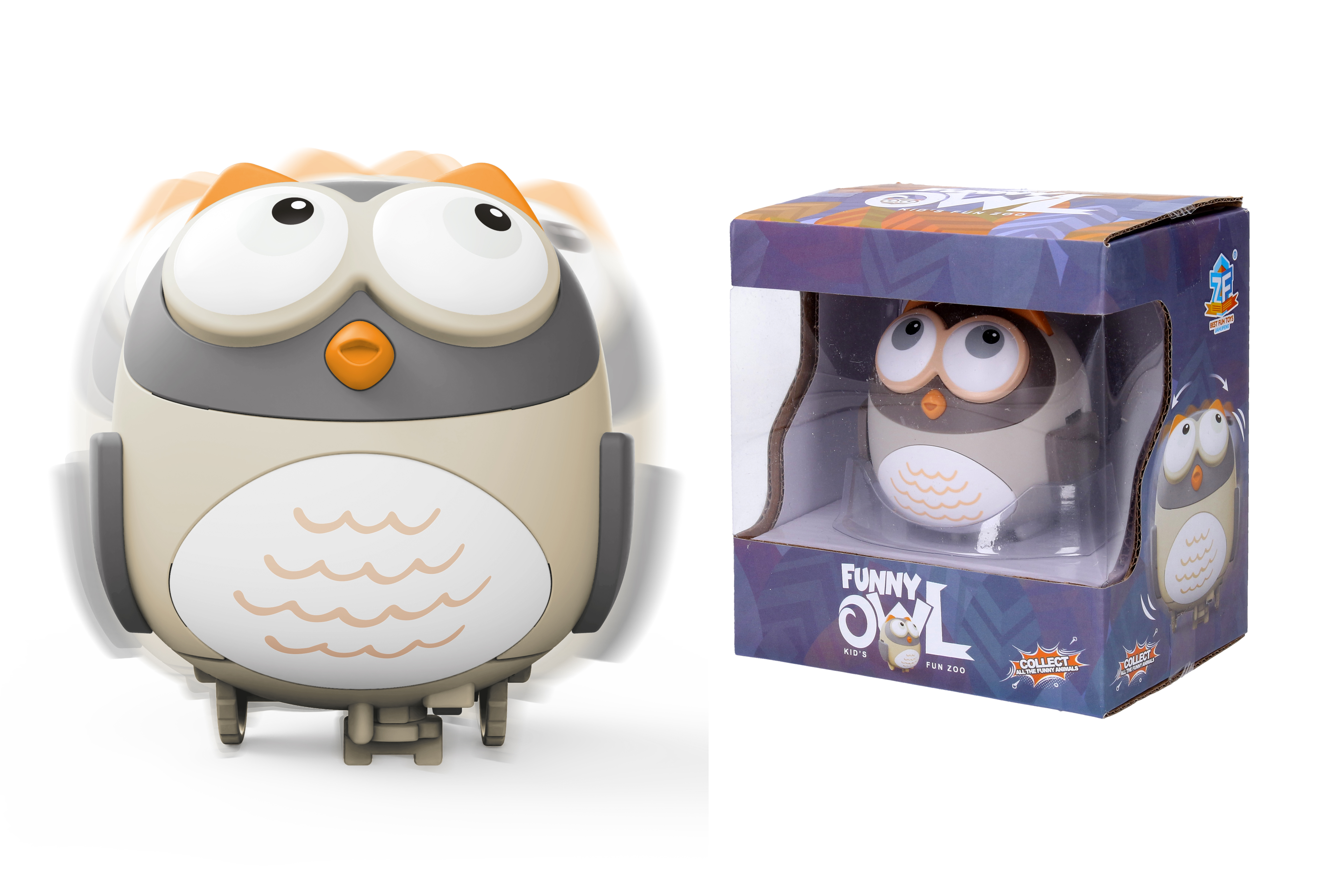 Sova jezdící. Velikost 7 cm. ON/OFF přepínač na spodní straně. Po aktivaci se sova pohybuje směrem dopředu. 2 AAA baterie, nejsou součástí. Křídla je možné manuálně vyklopit.