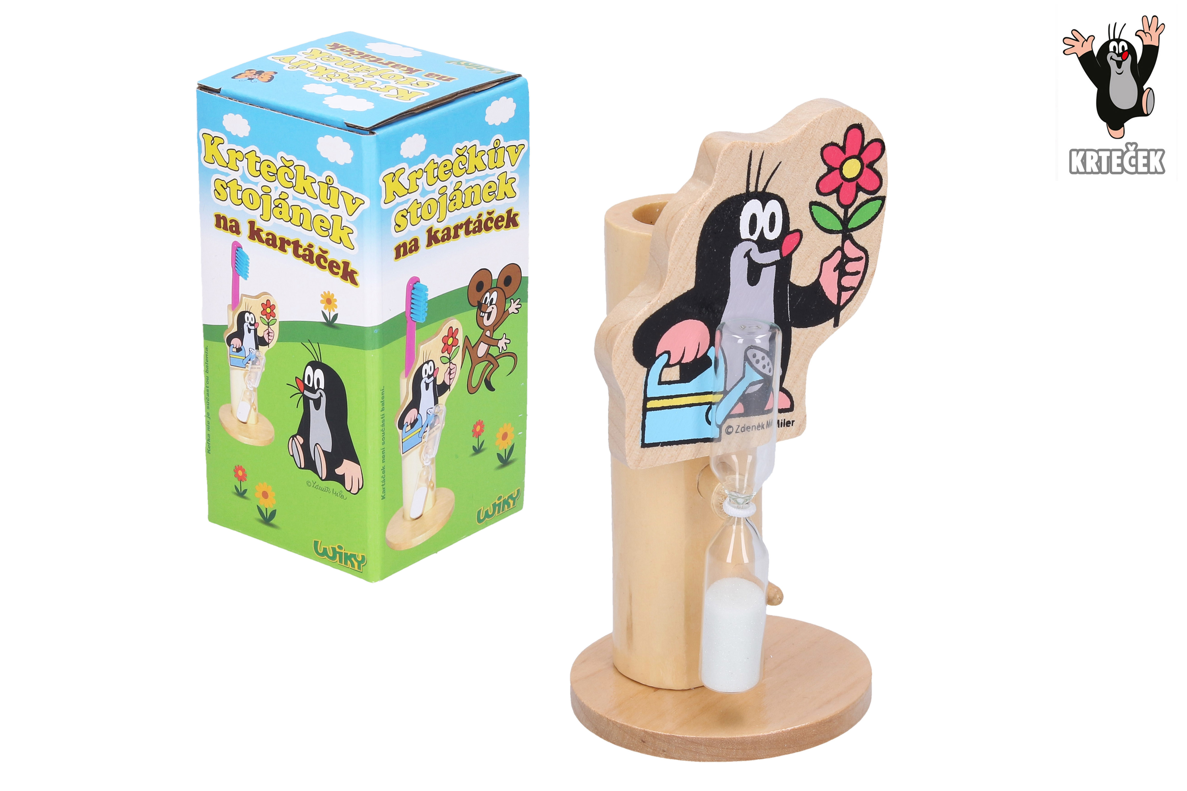 Stojánek na kartáček krtek. Dřevěný. Bez kartáčku. Součástí přesýpací hodiny. Velikost 13 cm. 1 varianta - konvička.