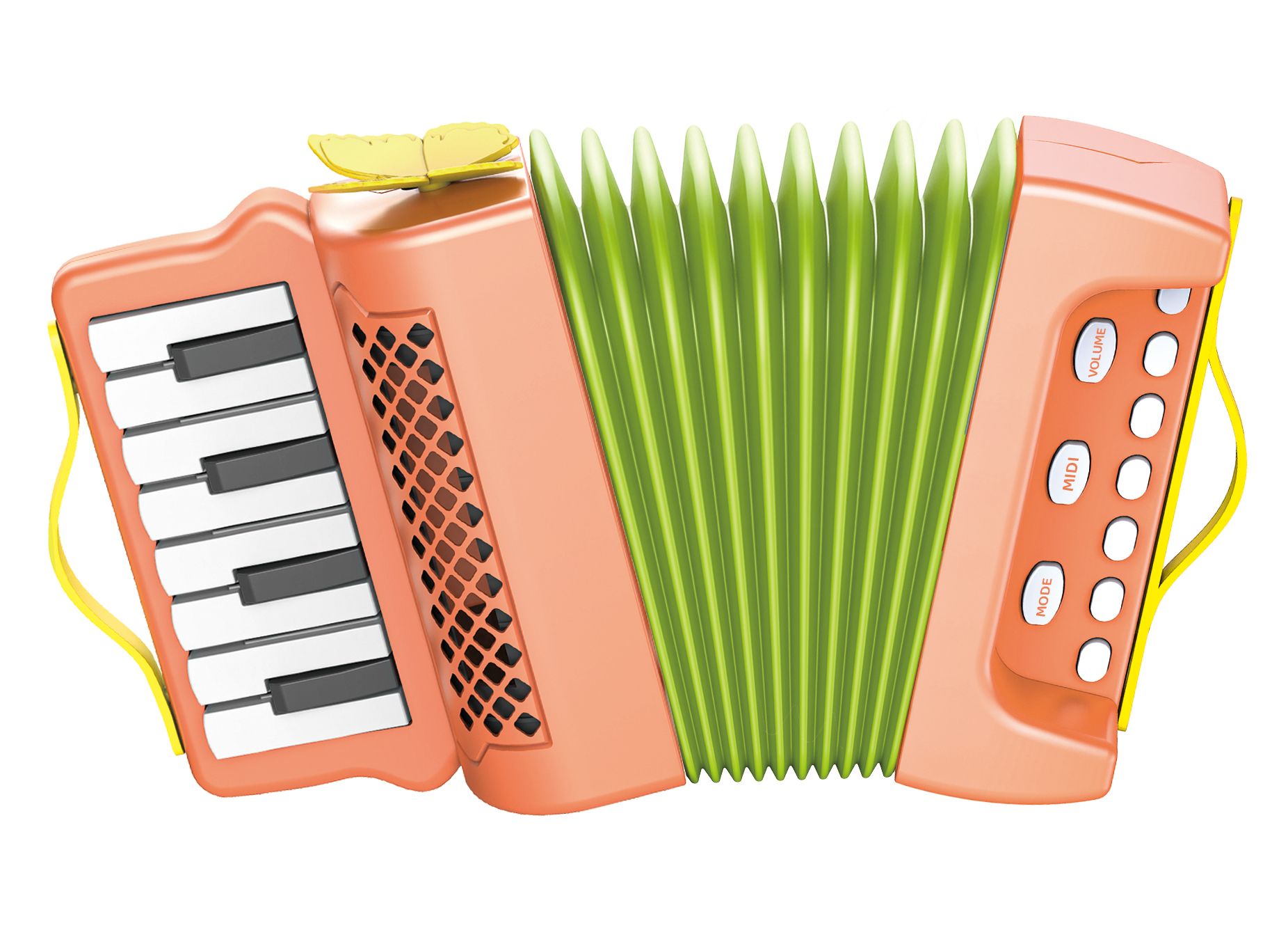 Tahací harmonika akordeon. Rozměry 14x6x23 cm. Zvukové efekty. 2xAA baterie nejsou součástí.
