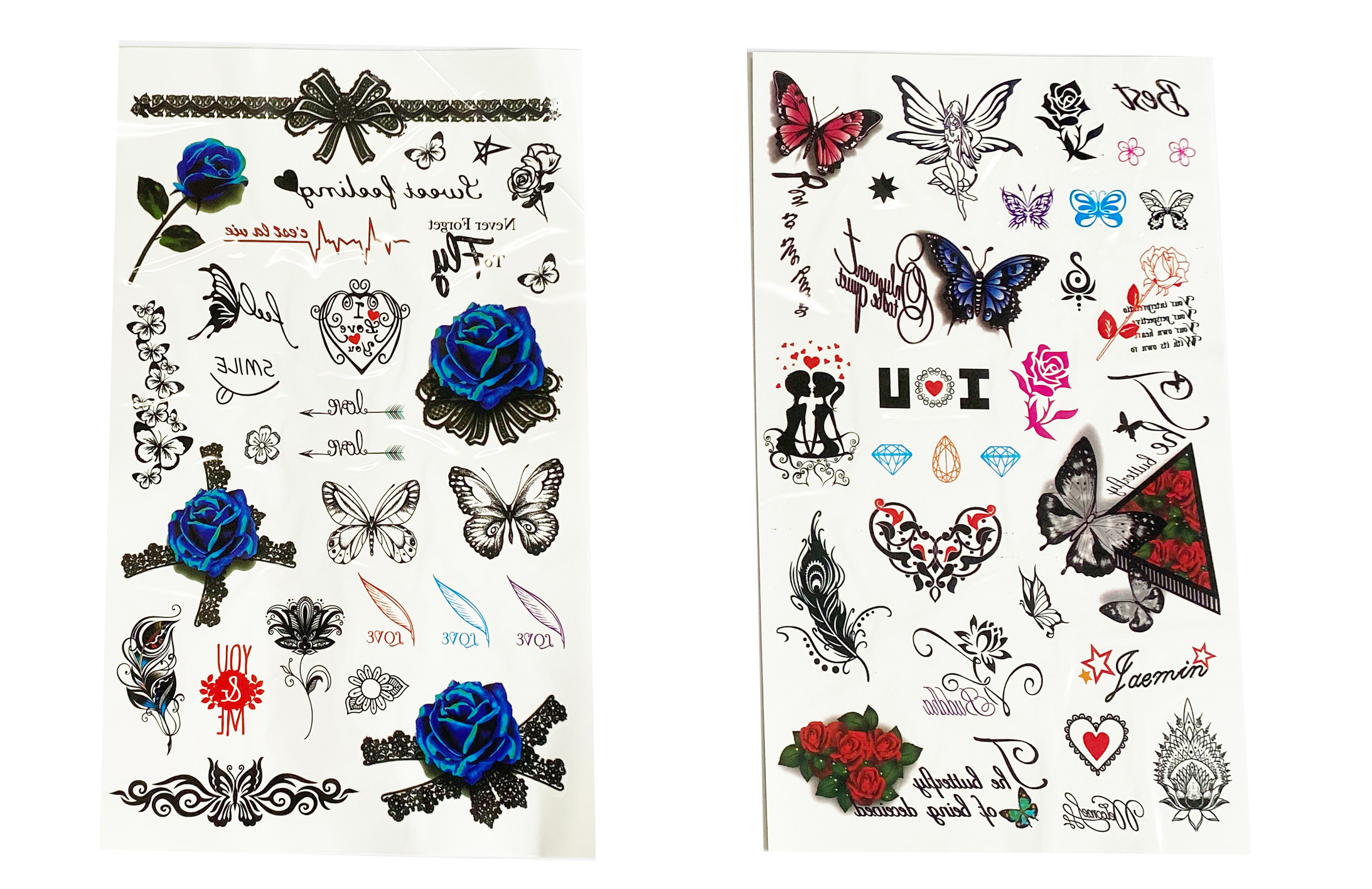 Tetovací samolepky holky. Rozměry archu: 15,3x0,1x25cm. Návod na aplikaci na obale: Sloupnout folii, přilepit papír s tetováním na pokožku, namočit a přitlačit houbičkou, sundat opatrně papír. 36 ks display box. 3 varianty.