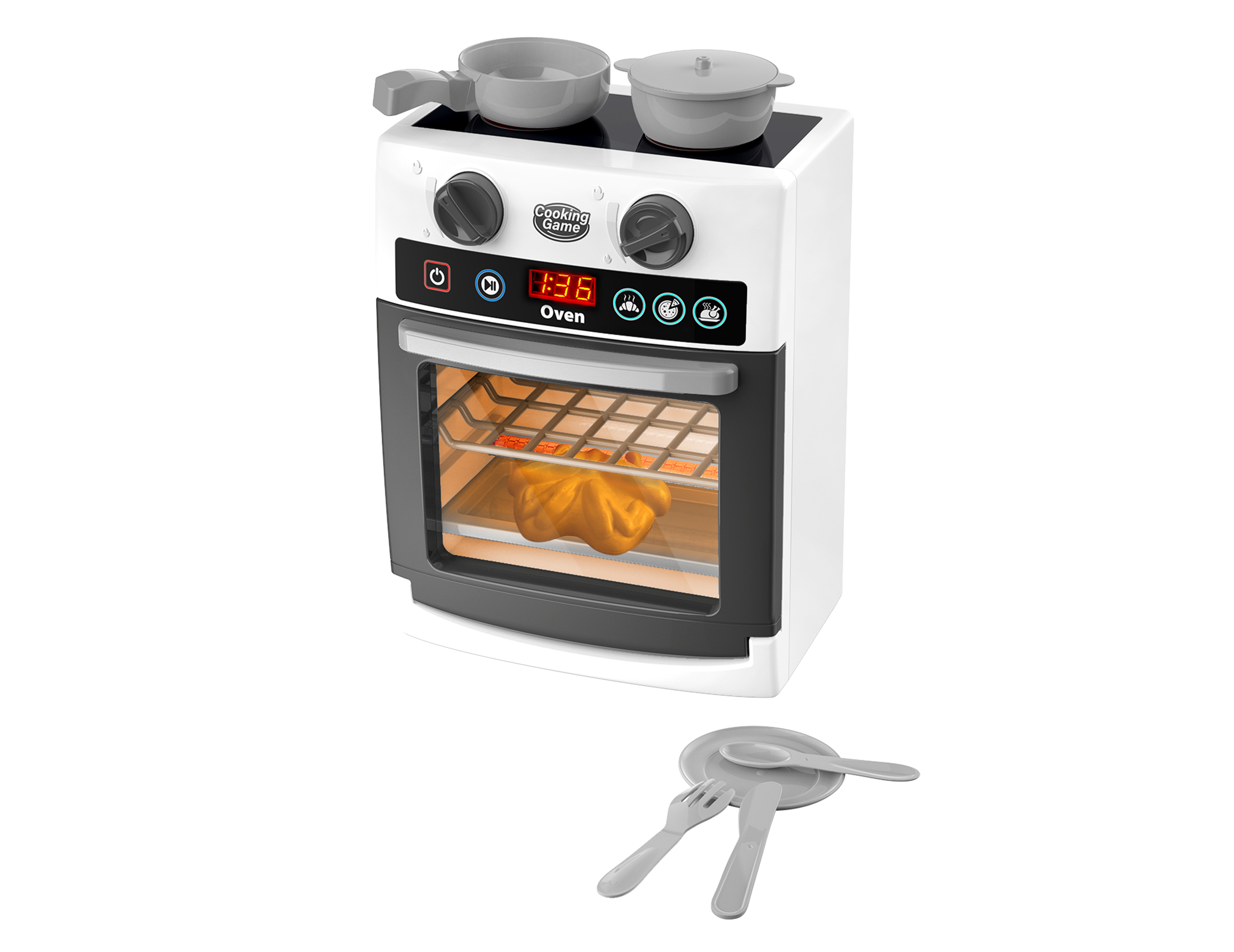 Trouba s efekty. Rozměry 20x13.8x25.5cm. světelné a zvukové efekty. Obsahuje nádobí a kuře. Ovládá se tlačítky na troubě, Tlačítko on/off troubu zapne a vybráním programu pečení se spustí odpočet. Aby trouba fungovala správně, musí mít zavřená dvířka. 3xAA baterie nejsou součástí.