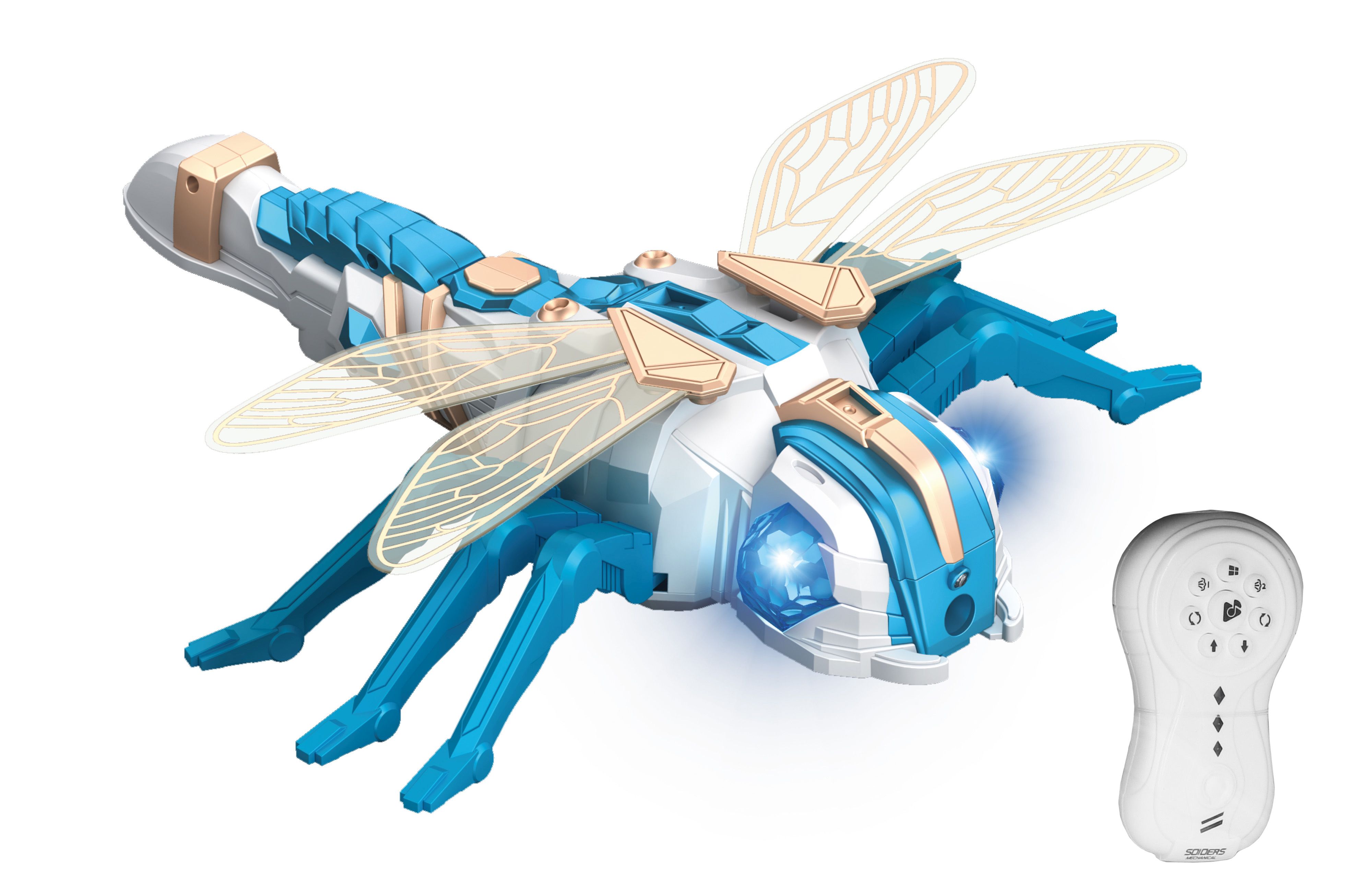 Vážka kouřící RC na dálkové ovládání. Rozměry 33x32x7,5 cm. Frekvence 2.4GHz. Světelné, zvukové a kouřové efekty. Tlačítka na ovladači - chůze dopředu, dozadu zatáčí, 3 módy kouřových efektů, 2 demo režimy, zvuk. 3.7V bateriový pack do vážky součástí, 2xAA do ovladače nejsou součástí. Přepínač ON/OFF na spodní straně vážky. Nádržka na vodu na spodní straně hlavy. USB kabel, nádobka na vodu součástí.