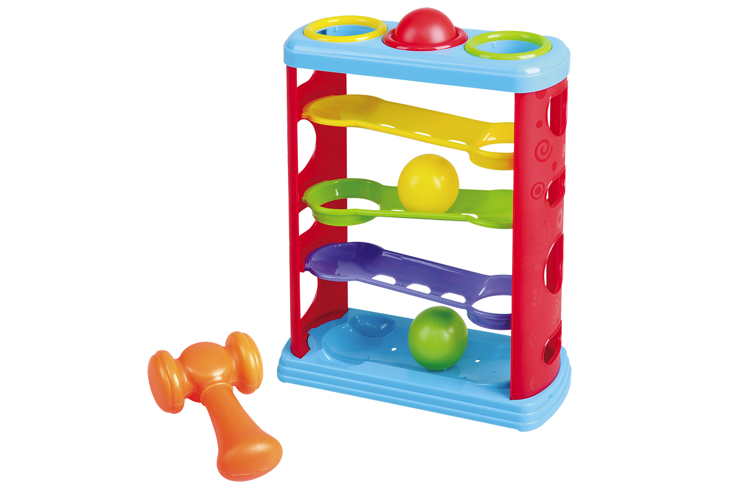 Věž s míčky a kladívkem. Obsahuje věž, kladívko a 3 míčky. Rozměry věže 24x10x27 cm.