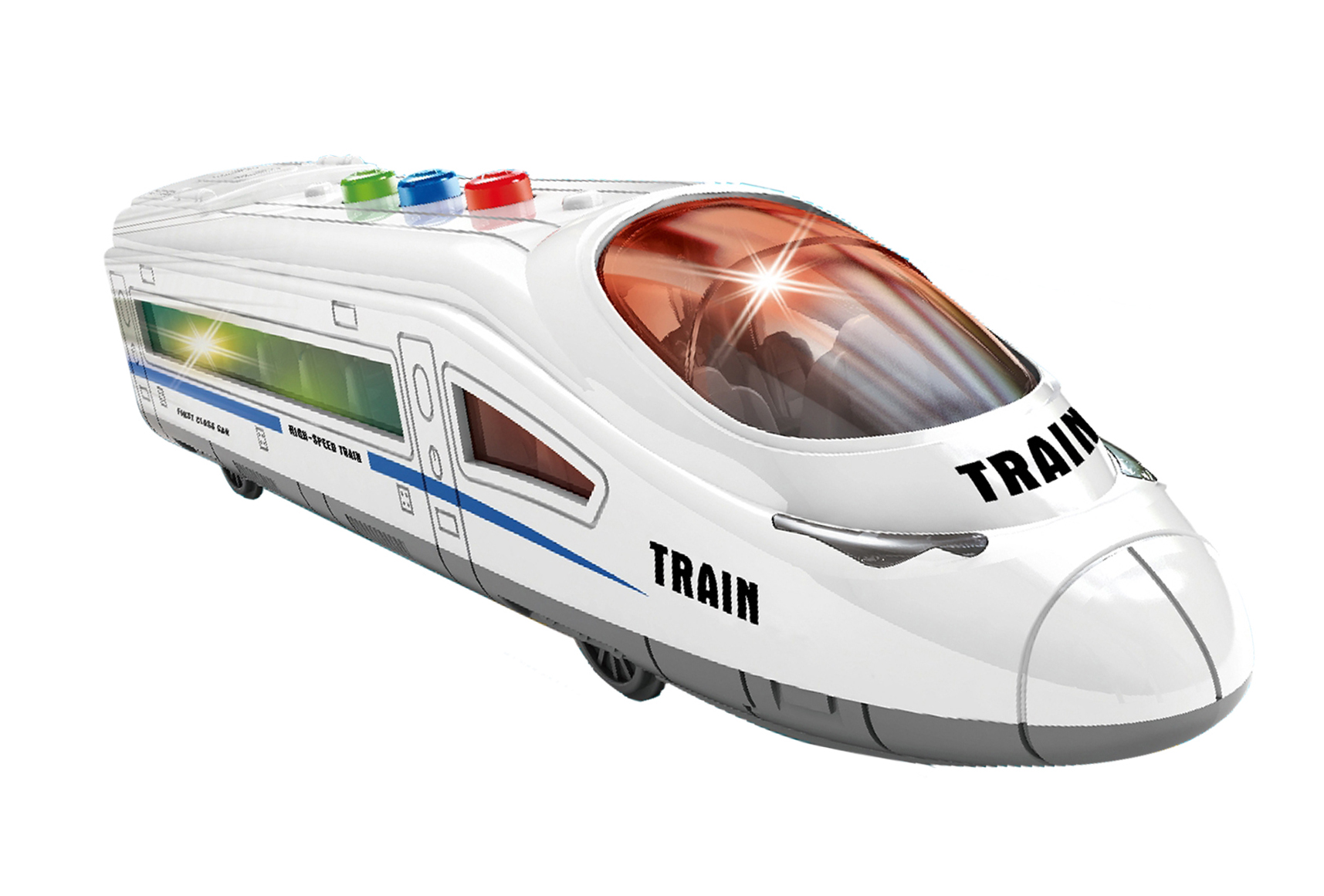 Vlak rychlostní na setrvačník. Velikost 21,5 cm. Vydává světelné a zvukové efekty (aktivace tlačítky na střeše). Přesné rozměry 21,5x4,5x5 cm. Baterie 3xAG13, součástí balení.