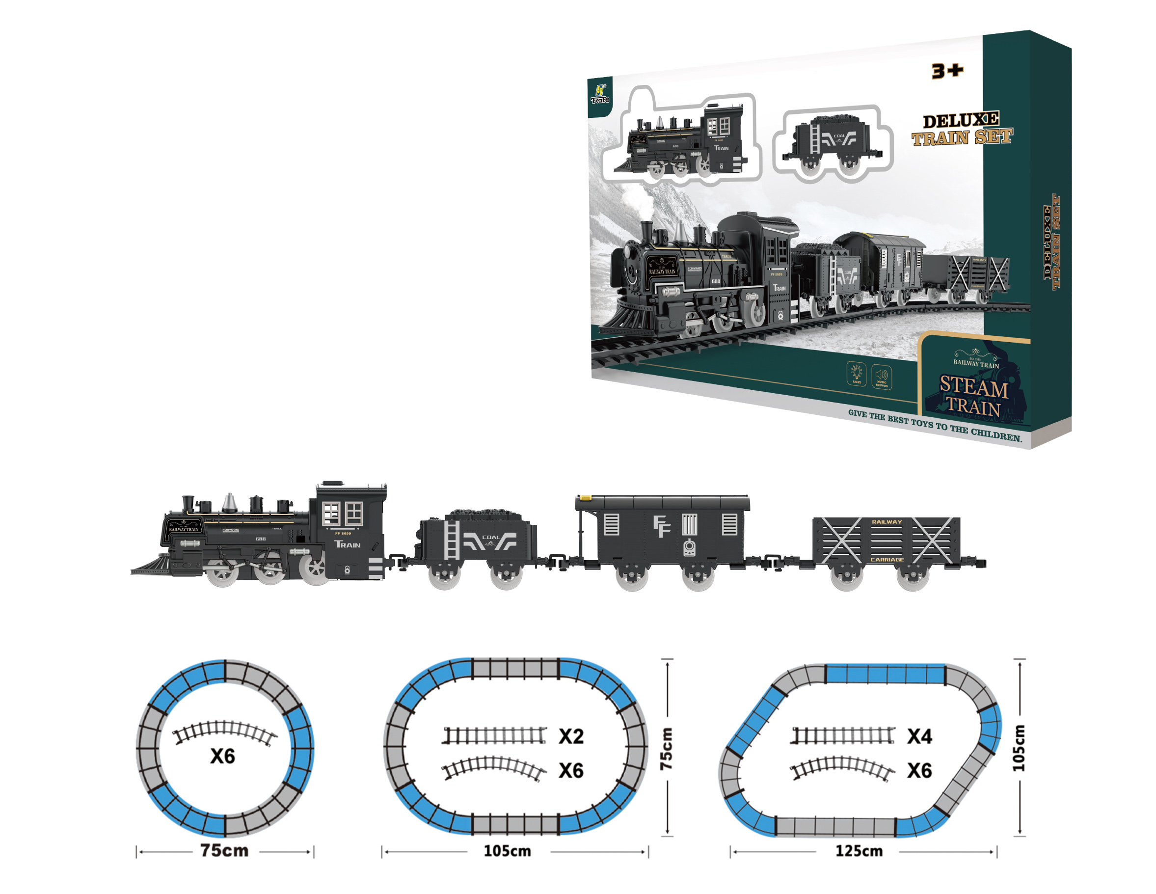 Vlak s kouřovými efekty set s dráhou 125x105 cm. Vlak vydává zvukové, a kouřové efekty. Voda se nalévá do nádržky pod stříbrným komínem. ON/OFF spínač na levém boku.