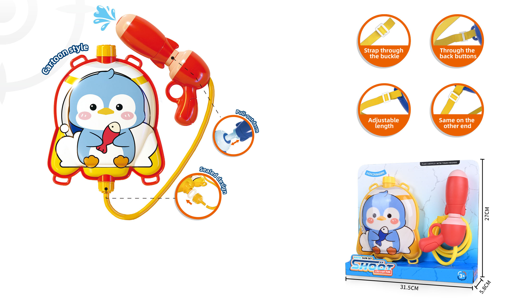 Vodní puška s nádržkou na záda tučňák. S popruhy. Střelba pumpováním. Rozměr nádržky 18x21 cm. Délka pistole 19 cm.