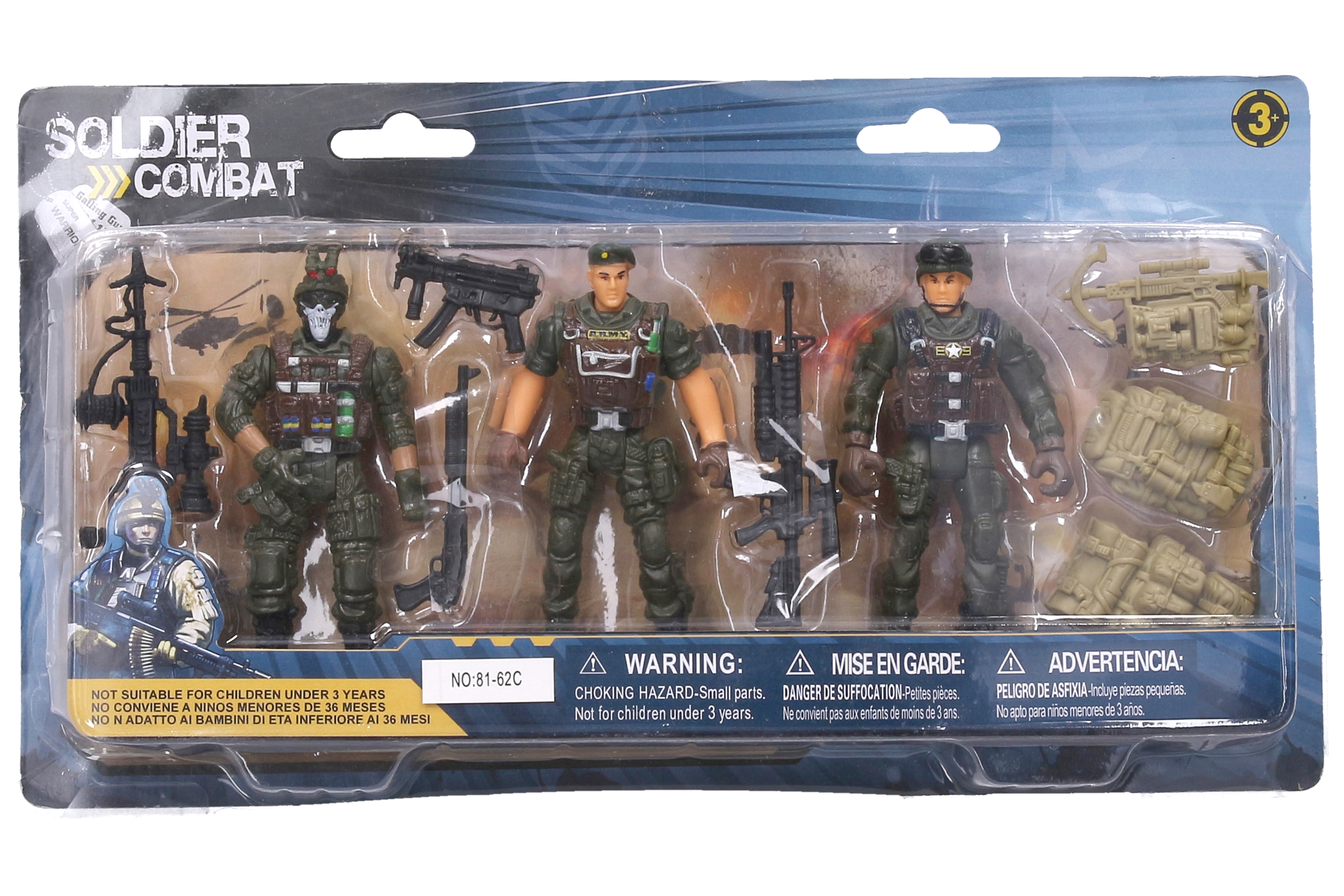 Vojáci sada figurek 11 cm a zbraní. Obsah balení - 3 x figurka vojáka 11 cm, 3x batoh s výstrojí, 4x zbraň.