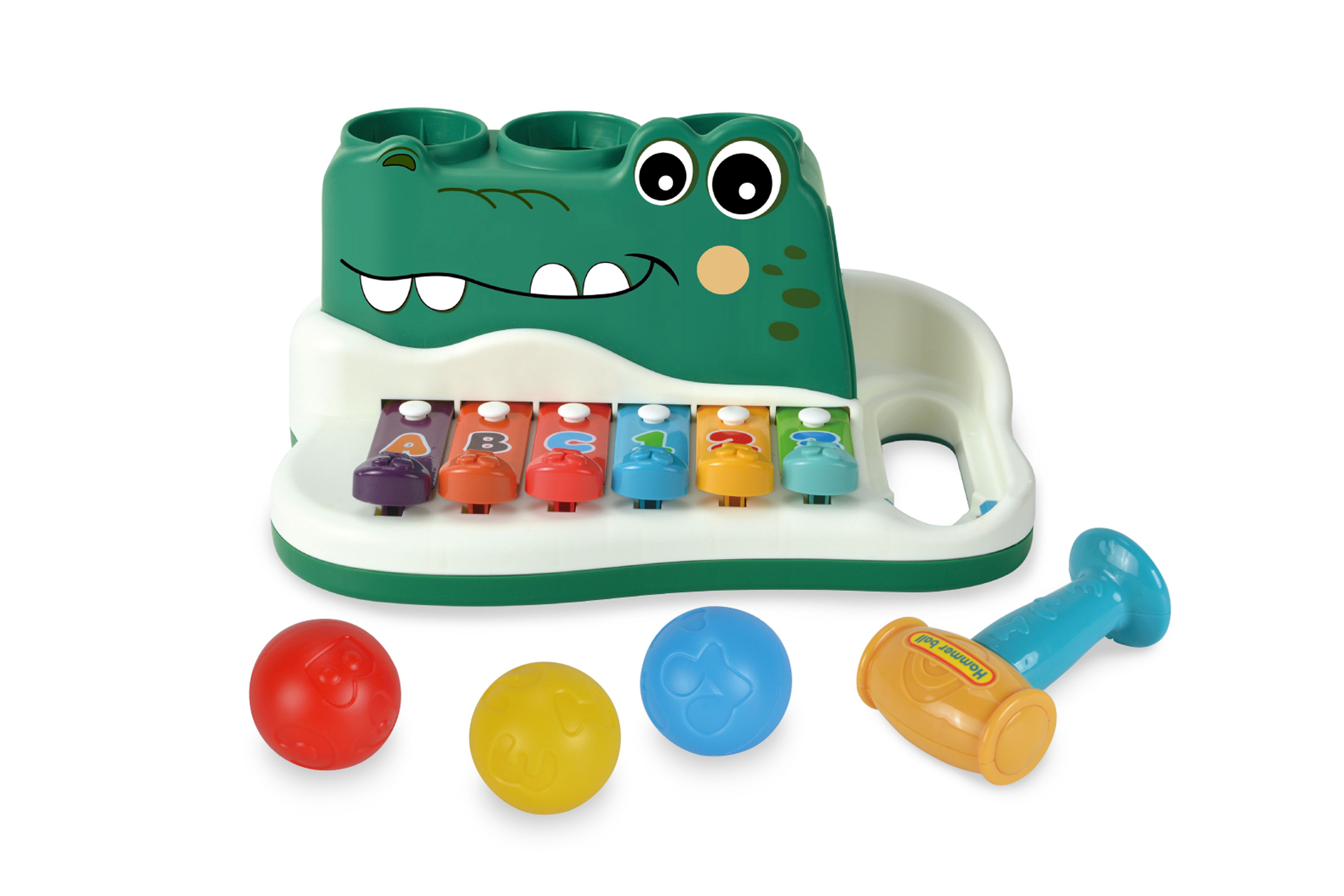 Xylofon zatloukačka krokodýl. Rozměry 25x16x12 cm. Kladívko a 3 míčky součástí.